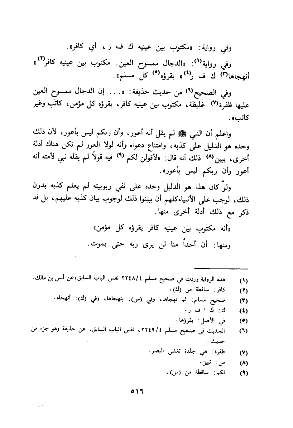 واعلم أن النبي صلى الله عليه وسلم لم يقل أنه أعور وأن ربكم ليس بأعور لأن ذلك وحده هو الدليل على كذبه وامتناع دعواه وأنه لولا العور لم تكن هناك أدلة أخرى يبين ذلك أنه قال: "لأقولن لكم فيه قولا لم يقله نبي لأمته أنه أعور وأن ربكم ليس بأعور".