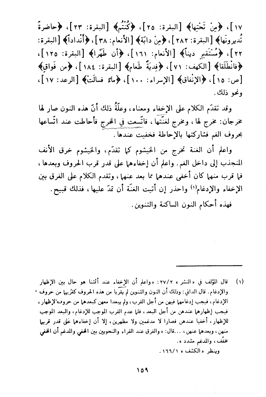 وعلة ذلك أن هذه النون صار لها مخرجان: مخرج لها، ومخرج لغنتها، فاتسعت في المخرج، فأحاطت عند اتساعها بحروف الضم، فشاركتها بالإحاطة، فخفيت عندها.
