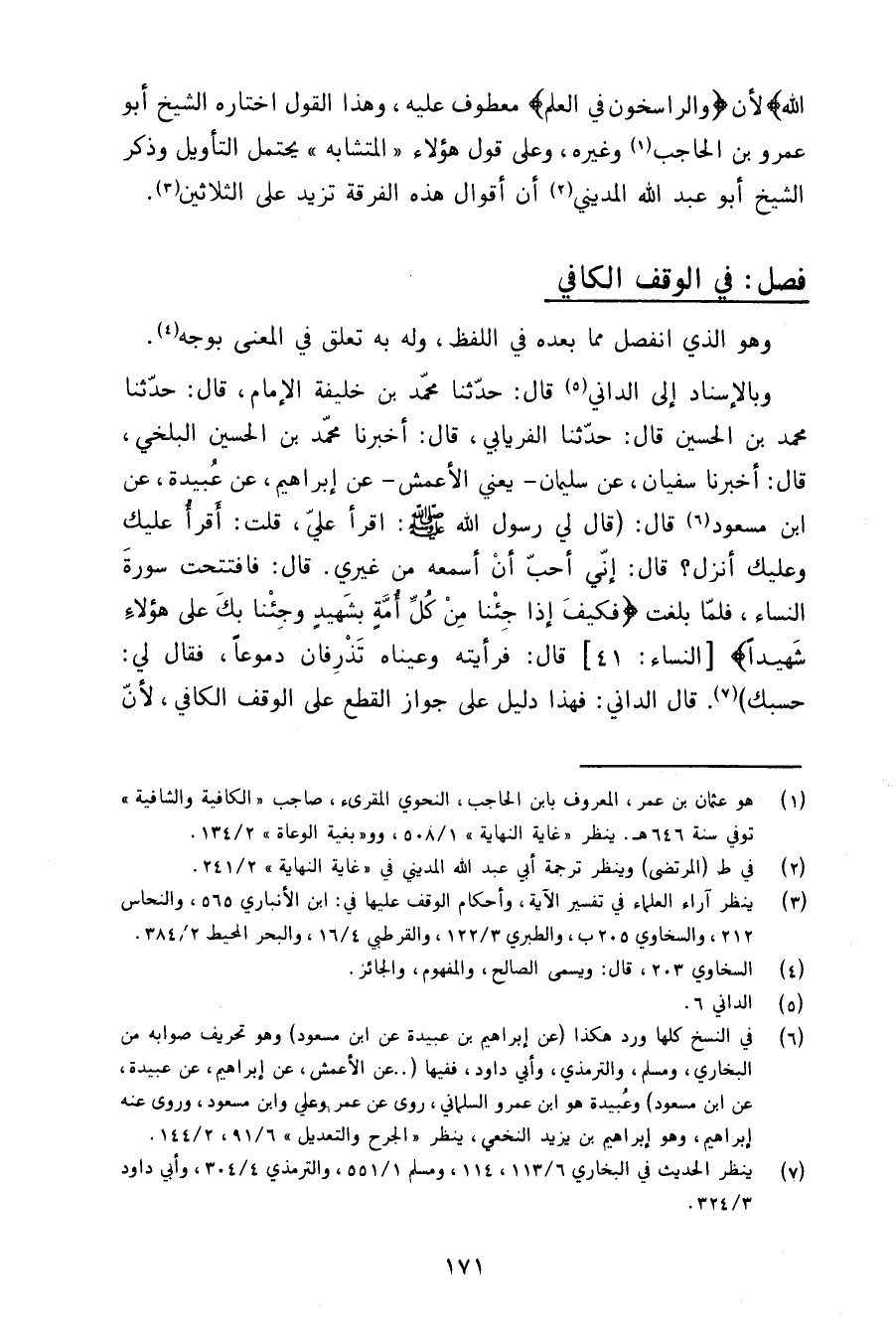 وهو الذي انفصل مما بعده في اللفظ، وله به تعلق في المعنى بوجه، وبالإسناد إلى الداني قال: حدثنا محمد بن خليفة الإمام، قال حدثنا محمد ابن الحسين، قال أخبرنا الفرياني، قال أخبرنا محمد بن الحسين البلخي، قال أخبرنا عبد الله بن المبارك، قال حدثنا سفيان عن سليمان، يعني الأعمش، عن إبراهيم، عن عبيدة، عن ابن مسعود، قال: قال لي رسول الله -صلى الله عليه وسلم- «اقرأ علي فقلت له: اقرأ عليك وعليك أنزل؟ قال: إني أحب أن أسمعه من غيري قال: فافتتحت سورة النساء، فلما بلغت {فكيف إذا جئنا من كل أمة بشهيد وجئنا بك على هؤلاء شهيداً} قال: فرأيته وعيناه تذرفان دموعاً، فقال لي: حسبك» قال الداني: وهذا دليل على جواز القطع على الوقف الكافي، لأن
