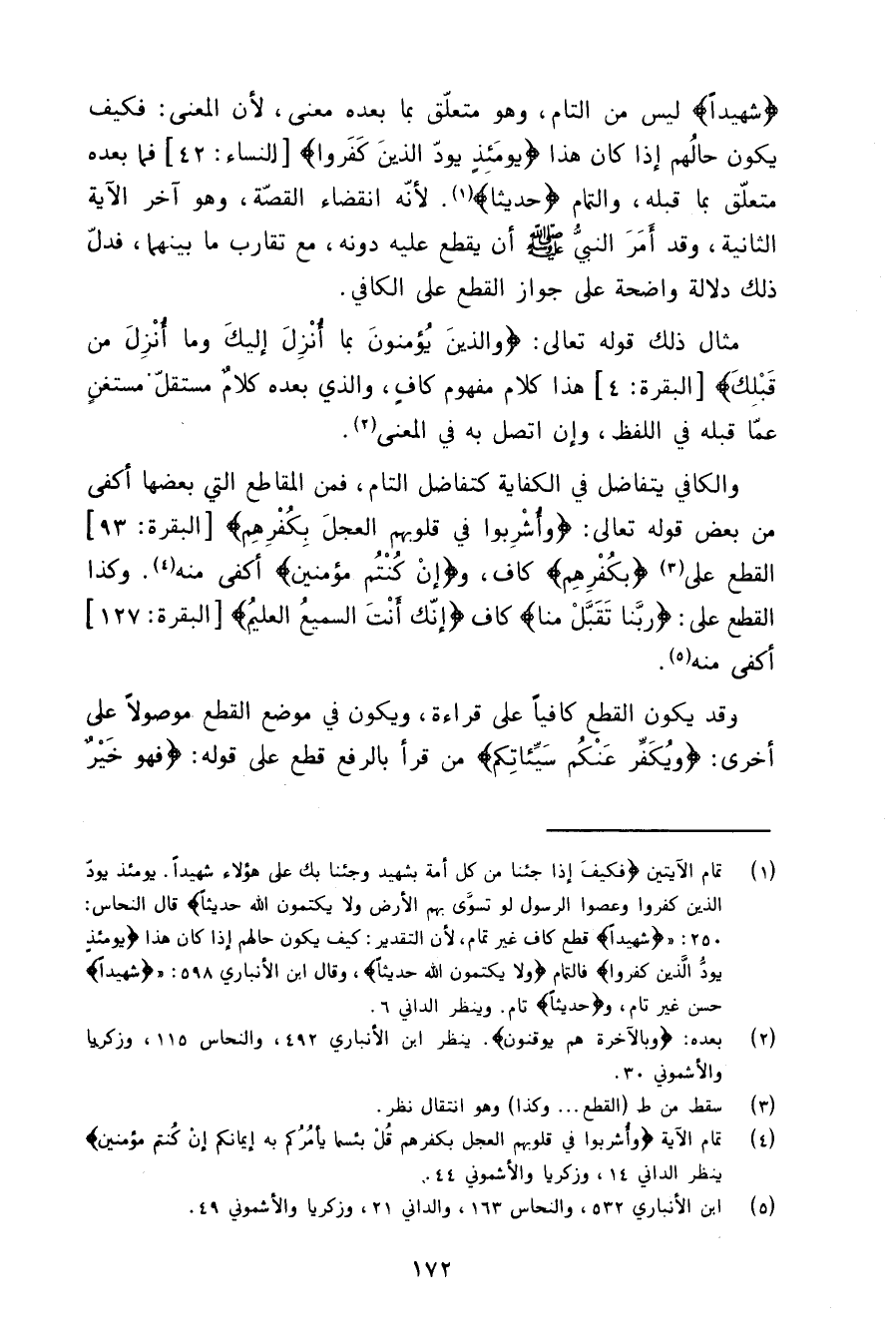 (شهيداً) ليس من التام، وهو متعلق بما بعده معنى، لأن المعنى: فكيف يكون حالهم إذا كان هذا، {يومئذ يود الذين كفروا} فما بعده متعلق بما قبله، والتمام (حديثاً) لأنه انقضاء القصة، وهو آخر الآية الثانية، وقد أمر النبي صلى الله عليه وسلم أن يقطع عليه دونه، مع تقارب ما بينهما، فدل ذلك دلالة واضحة على جواز القطع على الكافي.