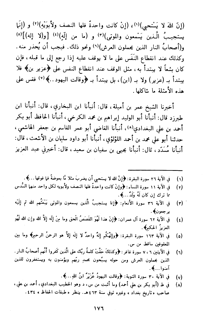 و {إن الله لا يستحيي} ، و {إن كانت واحدةً فلها النصف ولأبويه} ، {إنما يستجيب الذين يسمعون والموتى} و {ما من إله} و {لا إله} ، و {أصحاب النار * الذين يحملون العرش} ، ونحو ذلك، فيجب أن يحذر منه.