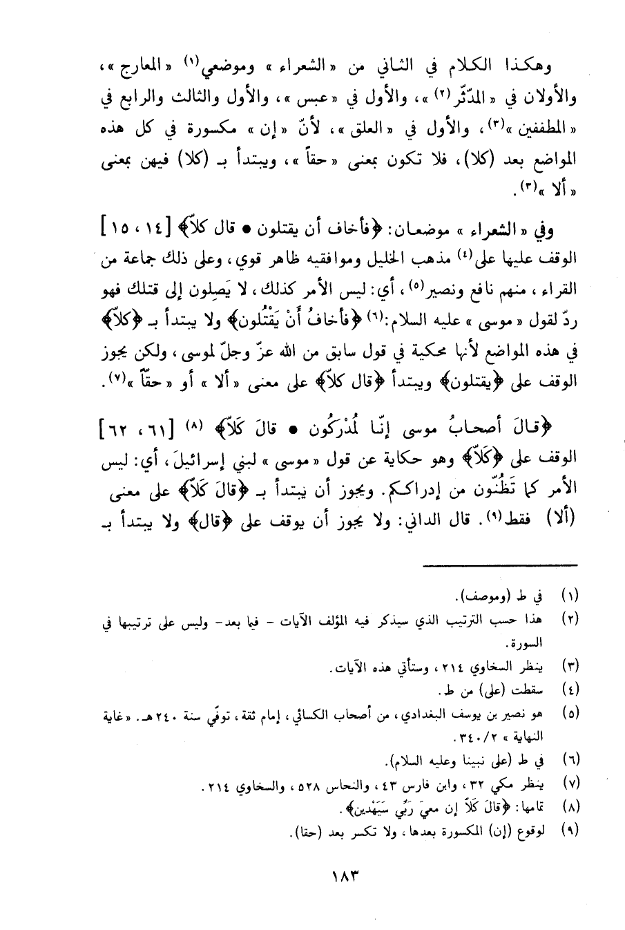 وفي الشعراء موضعان {فأخاف أن يقتلون * قال كلا} الوقف عليها على مذهب الخليل وموافقيه ظاهر قوي، وعلى ذلك جماعة من القراء منهم نافع ونصير، أي ليس الأمر كذلك، لا يصلون إلى قتلك، فهو رد لقول موسى عليه السلام: فأخاف أن يقتلون، ولا يبتدأ بكلا في هذا الموضع، ولكن يجوز الوقف على (يقتلون) ويبتدأ (قال كلا) على معنى ألا أو حقا.