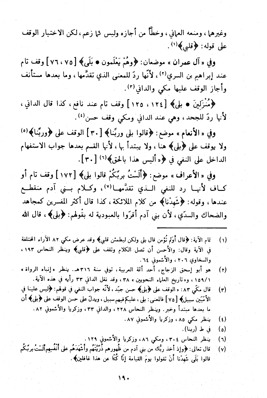 وفي الأنعام موضع {قالوا بلى وربنا} الوقف على و (ربنا) ولا يوقف على بلى هنا، ولا يبتدأ بها، لأنها والقسم بعدها جواب الاستفهام الداخل على النفي في {أليس هذا بالحق} ؟
