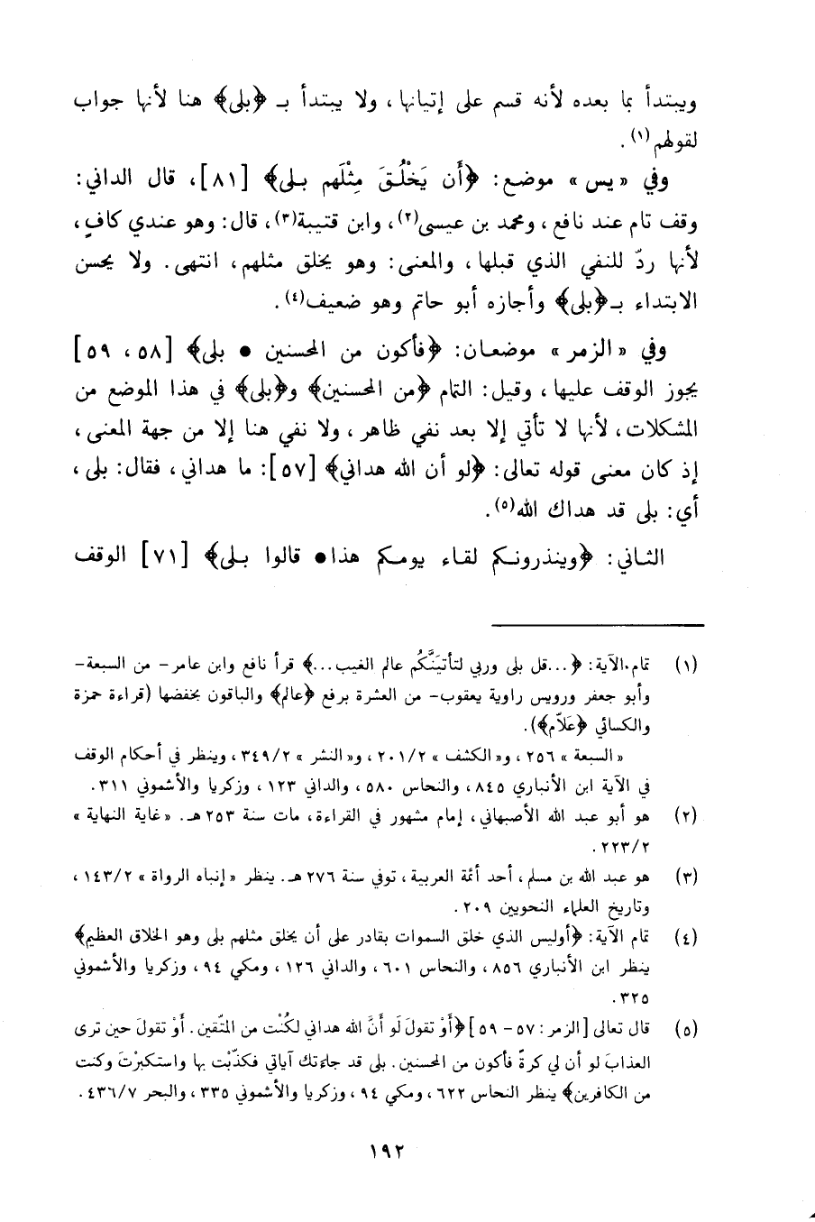 وفي يس موضع {أن يخلق مثلهم بلى} قال الداني وقف تام عند نافع ومحمد بن عيسى وابن قتيبة، قال: وهو عندي كاف، لأنها رد للنفي الذي قبلها، والمعنى وهو يخلق مثلهم، انتهى ولا يحسن الابتداء ببلى، وأجازه أبو حاتم وهو ضعيف.