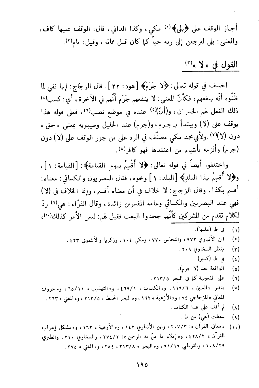 ولأبي محمد مكي مصنف في الرد على من جوز الوقف على (لا) دون (جرم) وألزمه بأشياء من اعتقدها فهو كافر.