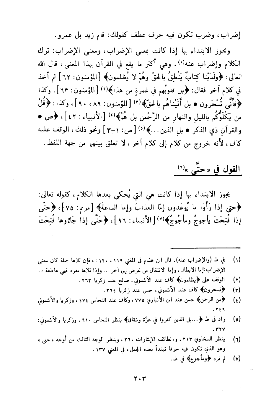 ويجوز الابتداء بها إذا كانت بمعنى الإضراب، ومعنى الإضراب ترك الكلام وإضراب عنه، وهي أكثر ما تقع في القرآن بهذا المعنى، قال الله تعالى: {ولدينا كتاب ينطق بالحق وهم لا يظلمون} ، ثم أخذ في كلام آخر فقال: {بل قلوبهم في غمرة من هذا} ، وكذا {فأنى تسحرون * بل أتيناهم بالحق} ، وكذا {قل من يكلؤكم بالليل والنهار من الرحمن بل هم} ، {ص والقرآن ذي الذكر * بل الذين} ونحو ذلك، الوقف عليه كاف، لأنه خروج من كلام إلى كلام آخر لا تعلق بينهما من جهة اللفظ.