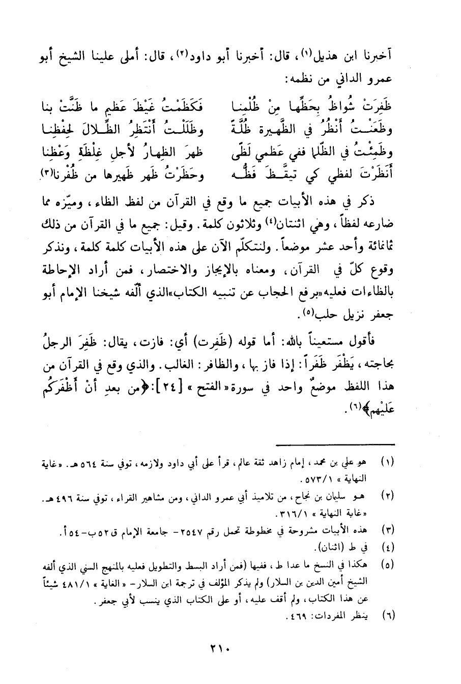 ذكر هذه الأبيات الأربعة جميع ما وقع في القرآن من لفظ الظاء، وميزه مما ضارعه لفظا، وهي اثنتان وثلاثون كلمة، وقيل جميع ما في القرآن من ذلك ثمانمائة وأحد عشر موضعا.