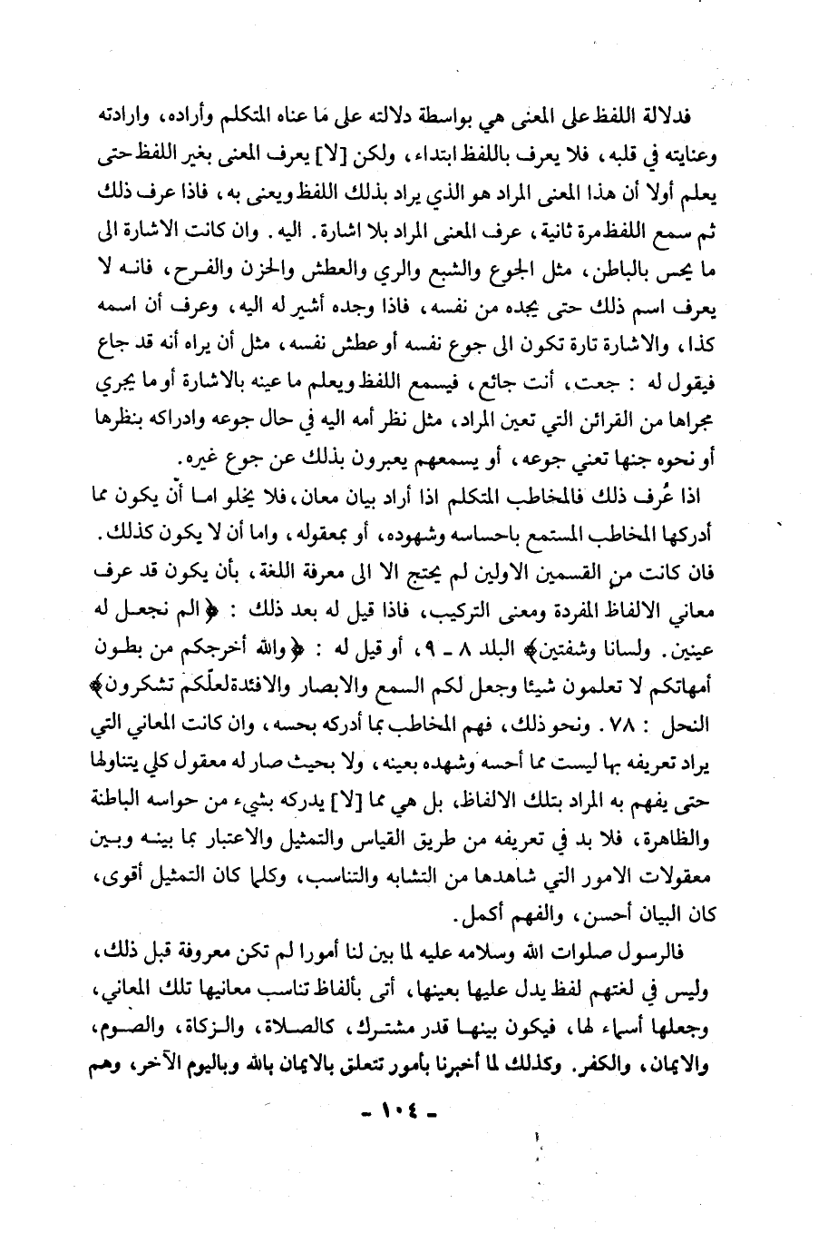 فَالرَّسُولُ صَلَوَاتُ اللَّهِ وَسَلَامُهُ عَلَيْهِ لَمَّا بَيَّنَ لَنَا أُمُورًا لَمْ تَكُنْ مَعْرُوفَةً قَبْلَ ذَلِكَ، وَلَيْسَ فِي لُغَتِهِمْ لَفْظٌ يَدُلُّ عَلَيْهَا بِعَيْنِهَا، أَتَى بِأَلْفَاظٍ تُنَاسِبُ مَعَانِيهَا تِلْكَ الْمَعَانِي، وَجَعَلَهَا أَسْمَاءَ لَهَا، فَيَكُونُ بَيْنَهَا قَدْرٌ مُشْتَرَكٌ، كَالصَّلَاةِ، وَالزَّكَاةِ، وَالصَّوْمِ، وَالْإِيمَانِ، وَالْكُفْرِ, وَكَذَلِكَ لَمَّا أُخْبِرْنَا بِأُمُورٍ تَتَعَلَّقُ بِالْإِيمَانِ بِاللَّهِ وَبِالْيَوْمِ الْآخِرِ، وَهُمْ