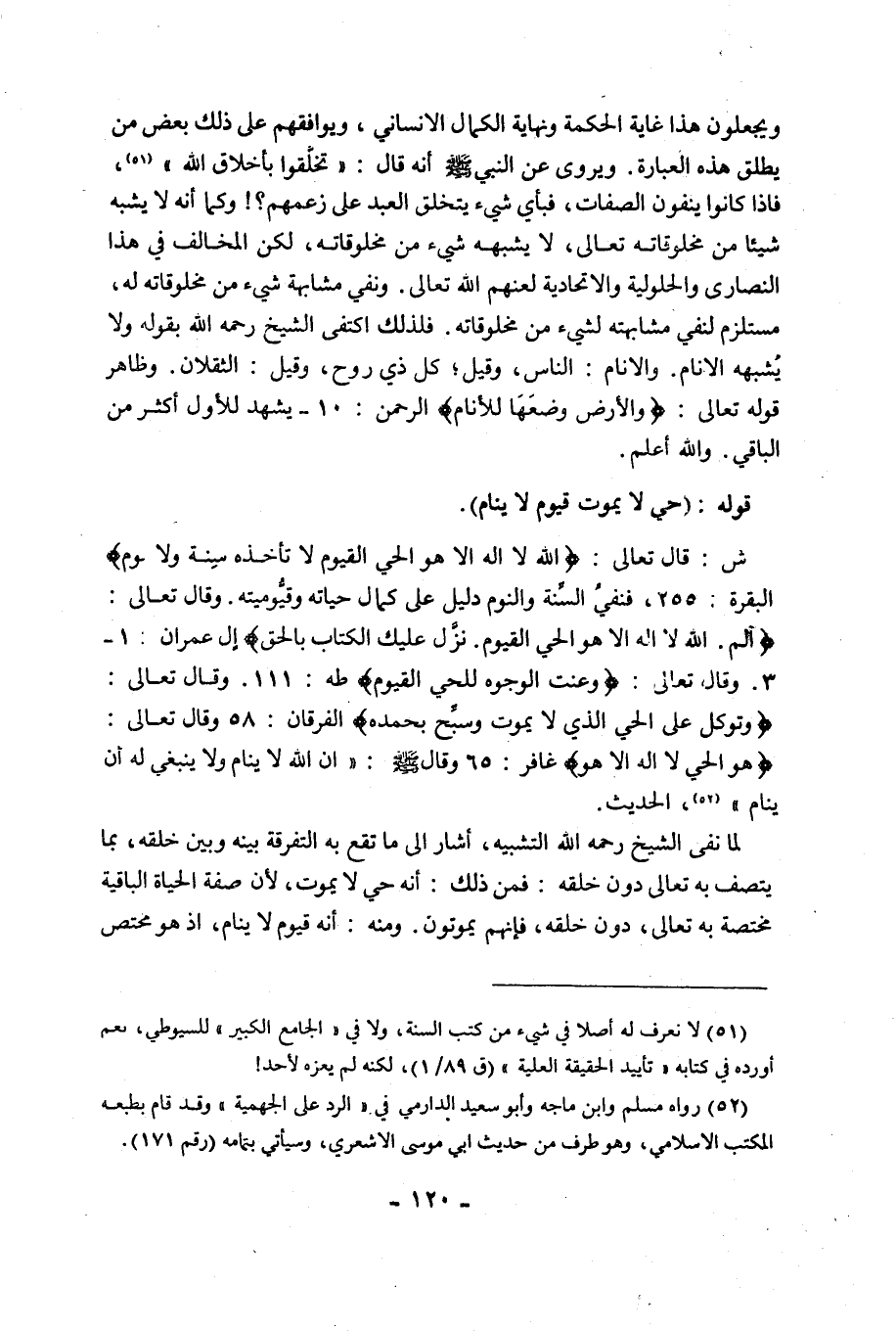 ش: قَالَ تَعَالَى: {اللَّهُ لَا إِلَهَ إِلاَّ هُوَ الْحَيُّ الْقَيُّومُ لَا تَأْخُذُهُ سِنَةٌ وَلَا نَوْمٌ} [سورة الْبَقَرَةِ: 255]، فَنَفْيُ السِّنَة وَالنَّوْمِ دَلِيلٌ عَلَى كَمَالِ حَيَاتِهِ وَقَيُّومِيَّتِهِ. وَقَالَ تَعَالَى: {الم، اللَّهُ لَا إِلَهَ إِلَّا هُوَ الْحَيُّ الْقَيُّومُ، نَزَّلَ عَلَيْكَ الْكِتَابَ بِالْحَقِّ}. وقال تعالى: {وَعَنَتِ الْوُجُوهُ لِلْحَيِّ الْقَيُّومِ} [سورة طَه: 111]. وَقَالَ تَعَالَى: {وَتَوَكَّلْ عَلَى الْحَيِّ الَّذِي لَا يَمُوتُ وَسَبِّحْ بِحَمْدِهِ} [الْفُرْقَانِ: 58]. وَقَالَ تَعَالَى: {هُوَ الْحَيُّ لَا إِلَهَ إِلَّا هُوَ} [سورة غافر: 65] , وَقَالَ صَلَّى اللَّهُ عَلَيْهِ وَسَلَّمَ: "إِنَّ اللَّهَ لَا يَنَامُ وَلَا يَنْبَغِي لَهُ أَنْ يَنَامَ" 2، الْحَدِيثَ.