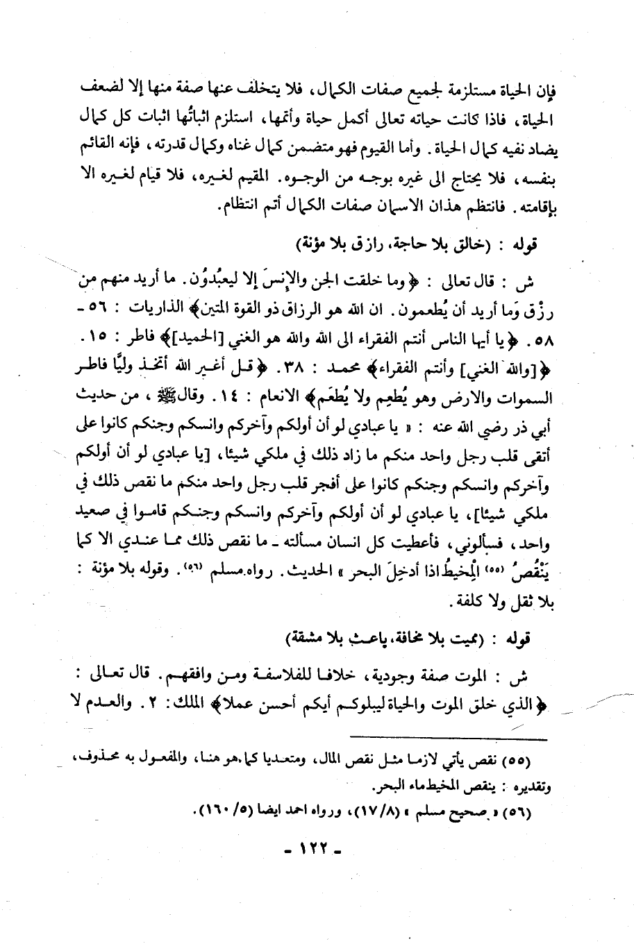 ش: قَالَ تَعَالَى: {وَمَا خَلَقْتُ الْجِنَّ وَالْإِنْسَ إِلَّا لِيَعْبُدُونِ، مَا أُرِيدُ مِنْهُمْ مِنْ رِزْقٍ وَمَا أُرِيدُ أَنْ يُطْعِمُونِ، إِنَّ اللَّهَ هُوَ الرَّزَّاقُ ذُو الْقُوَّةِ الْمَتِينُ} [الذَّارِيَاتِ: 56 - 58]. {يَا أَيُّهَا النَّاسُ أَنْتُمُ الْفُقَرَاءُ إِلَى اللَّهِ وَاللَّهُ هُوَ الْغَنِيُّ الْحَمِيدُ} [سورة فاطر: 15]. {وَاللَّهُ الْغَنِيُّ وَأَنْتُمُ الْفُقَرَاءُ} [سورة مُحَمَّدٍ: 38]. {قُلْ أَغَيْرَ اللَّهِ أَتَّخِذُ وَلِيًّا فَاطِرِ السَّمَاوَاتِ وَالْأَرْضِ وَهُوَ يُطْعِمُ وَلَا يُطْعَمُ} [سورة الْأَنْعَامِ: 14]. وَقَالَ صَلَّى اللَّهُ عَلَيْهِ وَسَلَّمَ، مِنْ حَدِيثِ أَبِي ذَرٍّ رَضِيَ اللَّهُ عَنْهُ: "يَا عبادي لو أن أولكم وآخركم وإنسكم وجنكم كَانُوا عَلَى أَتْقَى قَلْبِ رَجُلٍ وَاحِدٍ مِنْكُمْ مَا زَادَ ذَلِكَ فِي مُلْكِي شَيْئًا، [يَا عبادي لو أن أولكم وآخركم وإنسكم وجنكم كَانُوا عَلَى أَفْجَرِ قَلْبِ رَجُلٍ وَاحِدٍ مِنْكُمْ ما نقص ذَلِكَ فِي مُلْكِي شَيْئًا]، يَا عِبَادِي لَوْ أَنَّ أَوَّلَكُمْ وَآخِرَكُمْ وَإِنْسَكُمْ وَجِنَّكُمْ قَامُوا فِي صَعِيدٍ وَاحِدٍ، فَسَأَلُونِي، فَأَعْطَيْتُ كُلَّ إِنْسَانٍ مَسْأَلَتَهُ مَا نَقَصَ ذَلِكَ مِمَّا عِنْدِي إِلَّا كَمَا يَنْقُصُ 1 الْمِخْيَطُ إِذَا أُدْخِلَ الْبَحْرَ". الْحَدِيثَ. رَوَاهُ مسلم2. وقوله: بلا مؤنة. بِلَا ثِقَلٍ وَلَا كُلْفَةٍ.