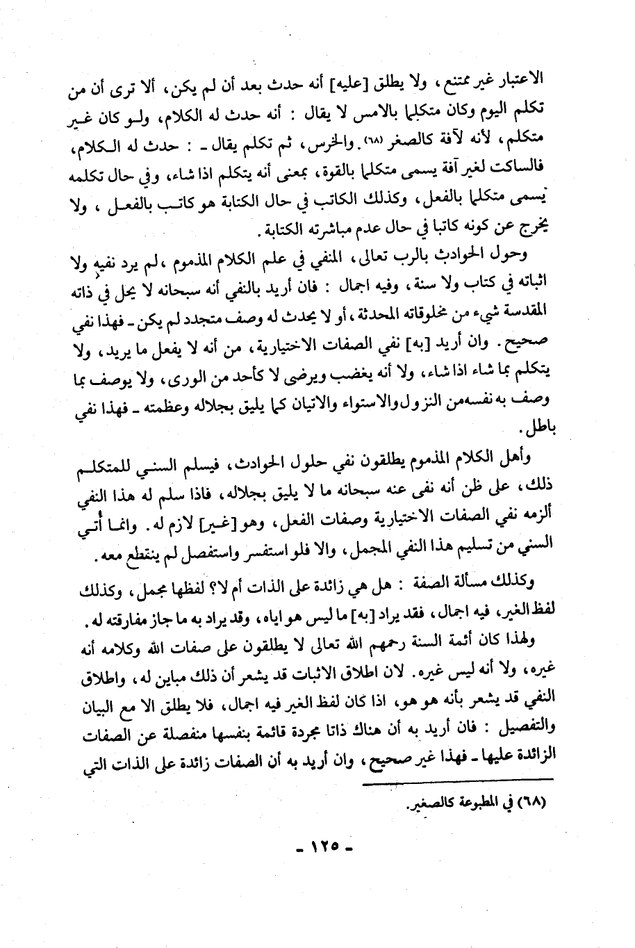 وَأَهْلُ الْكَلَامِ الْمَذْمُومِ يُطْلِقُونَ نَفْيَ حُلُولِ الْحَوَادِثِ، فَيُسَلِّمُ السُّنِّيُّ لِلْمُتَكَلِّمِ ذَلِكَ، عَلَى ظَنِّ أَنَّهُ نَفَى عَنْهُ سُبْحَانَهُ مَا لَا يَلِيقُ بِجَلَالِهِ، فَإِذَا سَلَّمَ لَهُ هَذَا النَّفْيَ أَلْزَمَهُ نفي الصفات الاختيارية وصفات الفعل، وهو [غير] لَازِمٌ لَهُ, وَإِنَّمَا أُتِيَ السُّنِّيُّ مِنْ تَسْلِيمِ هَذَا النَّفْيِ الْمُجْمَلِ، وَإِلَّا فَلَوِ اسْتَفْسَرَ وَاسْتَفْصَلَ لَمْ يَنْقَطِعْ مَعَهُ.