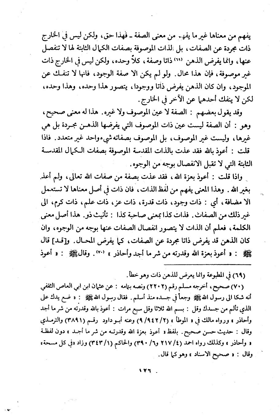 وَإِذَا قُلْتُ: أَعُوذُ بِعِزَّةِ اللَّهِ، فَقَدْ عُذْتُ بِصِفَةٍ مِنْ صِفَاتِ اللَّهِ تَعَالَى، وَلَمْ أَعُذْ بِغَيْرِ اللَّهِ, وَهَذَا الْمَعْنَى يُفْهَمُ مِنْ لَفْظِ الذَّاتِ، فَإِنَّ ذَاتَ فِي أَصْلِ مَعْنَاهَا لَا تُسْتَعْمَلُ إِلَّا مُضَافَةً، أَيْ: ذَاتُ وُجُودٍ، ذَاتُ قُدْرَةٍ، ذَاتُ عِزٍّ، ذَاتُ عِلْمٍ، ذَاتُ كَرَمٍ، إِلَى غَيْرِ ذَلِكَ مِنَ الصِّفَاتِ, فَذَاتُ كَذَا بِمَعْنَى صَاحِبَةِ كَذَا: تَأْنِيثُ ذُو, هَذَا أَصْلُ مَعْنَى الْكَلِمَةِ، فَعُلِمَ أَنَّ الذَّاتَ لَا يُتَصَوَّرُ انْفِصَالُ الصِّفَاتِ عَنْهَا بِوَجْهٍ مِنَ الْوُجُوهِ، وَإِنْ كَانَ الذِّهْنُ قَدْ يَفْرِضُ ذَاتًا مُجَرَّدَةً عن الصفات، كما يفرض المحال, و [قد] قَالَ صَلَّى اللَّهُ عَلَيْهِ وَسَلَّمَ: "أَعُوذُ بِعِزَّةِ اللَّهِ وَقُدْرَتِهِ مِنْ شَرِّ مَا أَجِدُ وَأُحَاذِرُ" 2. وقال صلى الله عليه وسلم: "أعوذ