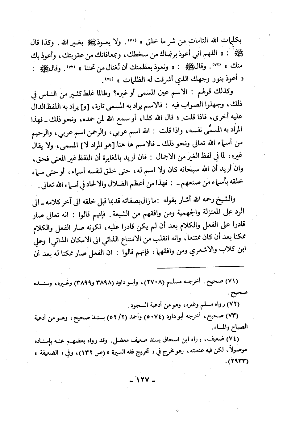 بِكَلِمَاتِ اللَّهِ التَّامَّاتِ مِنْ شَرِّ مَا خَلَقَ"1. وَلَا يَعُوذُ صَلَّى اللَّهُ عَلَيْهِ وَسَلَّمَ بِغَيْرِ اللَّهِ. وَكَذَا قَالَ صَلَّى اللَّهُ عَلَيْهِ وَسَلَّمَ: "اللَّهُمَّ إِنِّي أَعُوذُ بِرِضَاكَ مِنْ سَخَطِكَ، وَبِمُعَافَاتِكَ مِنْ عُقُوبَتِكَ، وَأَعُوذُ بِكَ مِنْكَ" 2. وَقَالَ صَلَّى اللَّهُ عَلَيْهِ وَسَلَّمَ: "وَنَعُوذُ بِعَظَمَتِكَ أَنْ نُغْتَالَ مِنْ تَحْتِنَا" 3. وَقَالَ صَلَّى اللَّهُ عَلَيْهِ وَسَلَّمَ: "أَعُوذُ بِنُورِ وَجْهِكَ الَّذِي أَشْرَقَتْ لَهُ الظُّلُمَاتُ"4.