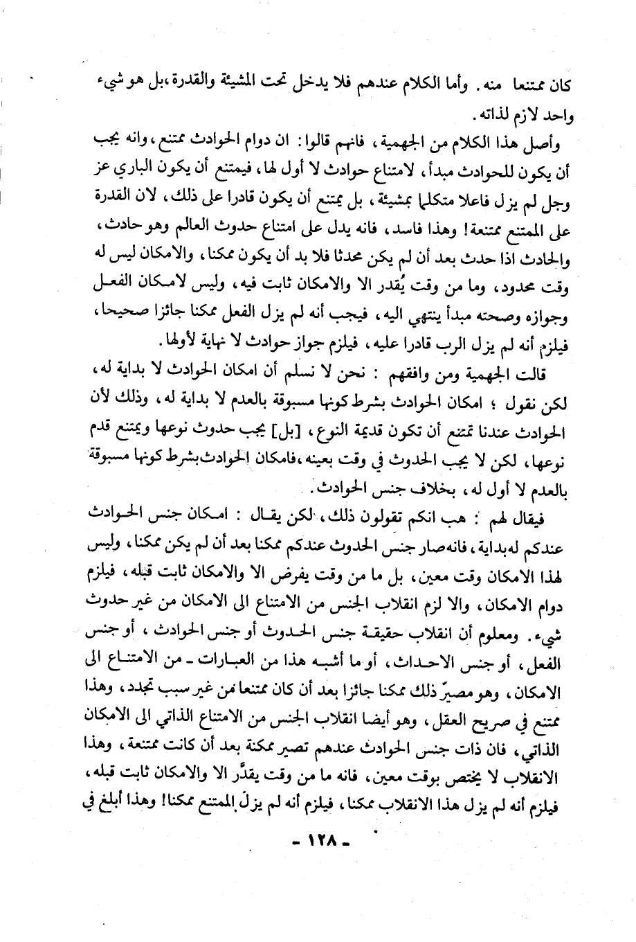 وَأَصْلُ هَذَا الْكَلَامِ مِنَ الْجَهْمِيَّةِ، فَإِنَّهُمْ قَالُوا: إِنَّ دَوَامَ الْحَوَادِثِ مُمْتَنِعٌ، وَإِنَّهُ يَجِبُ أَنْ يَكُونَ لِلْحَوَادِثِ مَبْدَأٌ، لِامْتِنَاعِ حَوَادِثَ لَا أَوَّلَ لَهَا، فَيَمْتَنِعُ أَنْ يَكُونَ الْبَارِي عَزَّ وَجَلَّ لَمْ يَزَلْ فَاعِلًا مُتَكَلِّمًا بمشيئة، بَلْ يَمْتَنِعُ أَنْ يَكُونَ قَادِرًا عَلَى ذَلِكَ؛ لِأَنَّ الْقُدْرَةَ عَلَى الْمُمْتَنِعِ مُمْتَنِعَةٌ! وَهَذَا فَاسِدٌ، فَإِنَّهُ يَدُلُّ عَلَى امْتِنَاعِ حُدُوثِ الْعَالَمِ وَهُوَ حَادِثٌ، وَالْحَادِثُ إِذَا حَدَثَ بَعْدَ أَنْ لَمْ يَكُنْ مُحْدَثًا فَلَا بُدَّ أَنْ يَكُونَ مُمْكِنًا، وَالْإِمْكَانُ لَيْسَ لَهُ وَقْتٌ مَحْدُودٌ، وَمَا مِنْ وَقْتٍ يُقَدَّرُ إِلَّا وَالْإِمْكَانُ ثَابِتٌ فِيهِ، وَلَيْسَ لِإِمْكَانِ الْفِعْلِ وَجَوَازِهِ وَصِحَّتِهِ مَبْدَأٌ يَنْتَهِي إِلَيْهِ، فَيَجِبُ أَنَّهُ لَمْ يَزَلِ الْفِعْلُ مُمْكِنًا جَائِزًا صَحِيحًا، فَيَلْزَمُ أَنَّهُ لَمْ يَزَلِ الرَّبُّ قَادِرًا عَلَيْهِ، فَيَلْزَمُ جَوَازُ حَوَادِثَ لَا نِهَايَةَ لِأَوَّلِهَا.