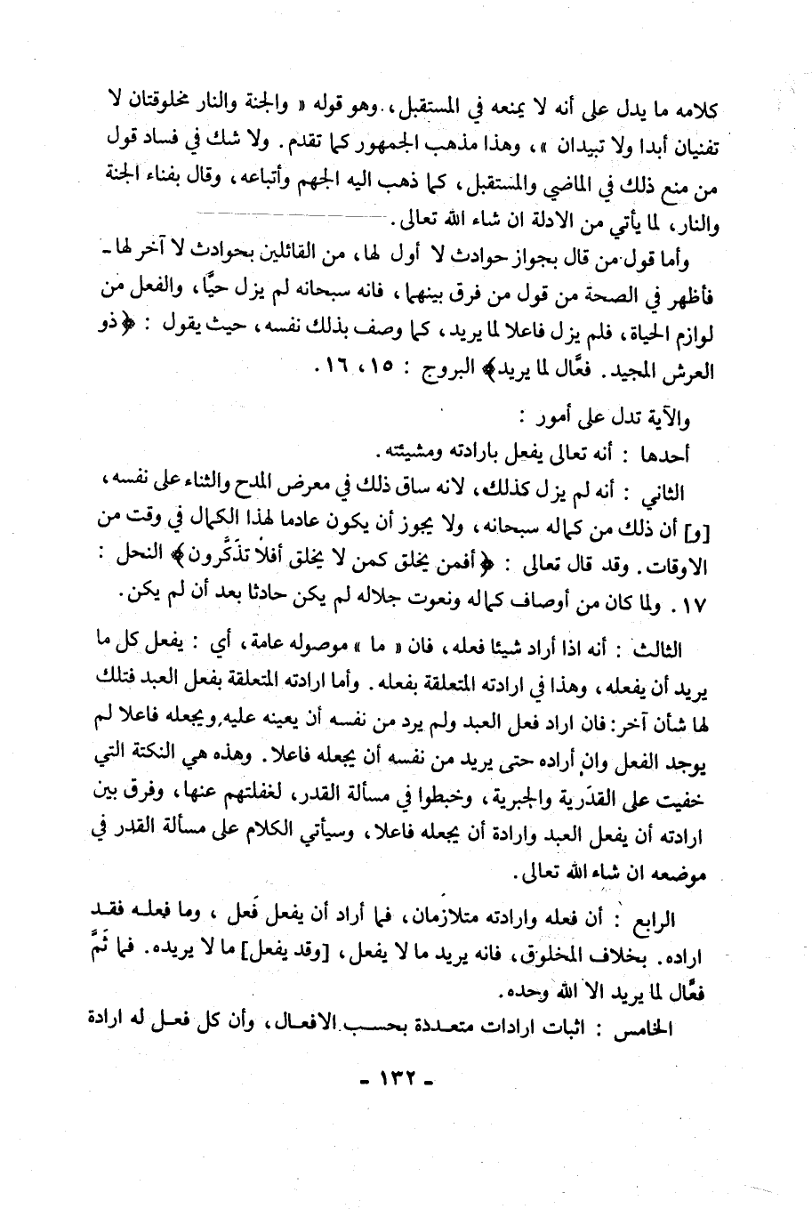 أَحَدُهَا: أَنَّهُ تَعَالَى يَفْعَلُ بِإِرَادَتِهِ وَمَشِيئَتِهِ.