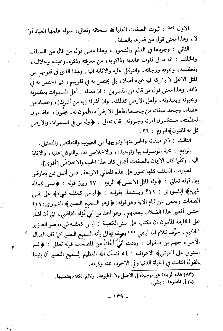 الْأَوَّلُ1: ثُبُوتُ الصِّفَاتِ الْعُلْيَا لِلَّهِ سُبْحَانَهُ وَتَعَالَى، سَوَاءً عَلِمَهَا الْعِبَادُ أَوْ لَا، وَهَذَا مَعْنَى قَوْلِ مَنْ فَسَّرَهَا بِالصِّفَةِ.