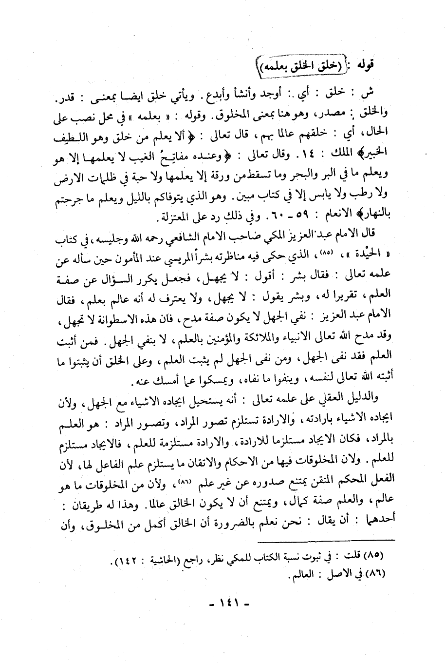 قَالَ الْإِمَامُ عَبْدُ الْعَزِيزِ الْمَكِّيُّ صَاحِبُ الْإِمَامِ الشَّافِعِيِّ رَحِمَهُ اللَّهُ وَجَلِيسُهُ، فِي كِتَابِ "الْحَيْدَةِ"1، الَّذِي حَكَى فِيهِ مُنَاظَرَتَهُ بِشْرًا الْمَرِيسِيَّ عِنْدَ الْمَأْمُونِ حِينَ سَأَلَهُ عَنْ عِلْمِهِ تَعَالَى: فَقَالَ بِشْرٌ: أَقُولُ: لَا يَجْهَلُ، فَجَعَلَ يُكَرِّرُ السُّؤَالَ عَنْ صِفَةِ الْعِلْمِ، تَقْرِيرًا لَهُ، وَبِشْرٌ يَقُولُ: لَا يَجْهَلُ، وَلَا يَعْتَرِفُ لَهُ أَنَّهُ عَالِمٌ بِعِلْمٍ، فَقَالَ الْإِمَامُ عَبْدُ الْعَزِيزِ: نَفْيُ الْجَهْلِ لَا يكون صفة مدح، فإن هذه الأسطوانة لا تجهل، وَقَدْ مَدَحَ اللَّهُ تَعَالَى الْأَنْبِيَاءَ وَالْمَلَائِكَةَ وَالْمُؤْمِنِينَ بِالْعِلْمِ، لَا بِنَفْيِ الْجَهْلِ, فَمَنْ أَثْبَتَ الْعِلْمَ فَقَدْ نَفَى الْجَهْلَ، وَمَنْ نَفَى الْجَهْلَ لَمْ يُثْبِتِ الْعِلْمَ، وَعَلَى الْخَلْقِ أَنْ يُثْبِتُوا مَا أَثْبَتَهُ اللَّهُ تَعَالَى لِنَفْسِهِ، وَيَنْفُوا مَا نَفَاهُ، وَيُمْسِكُوا عَمَّا أَمْسَكَ عَنْهُ.