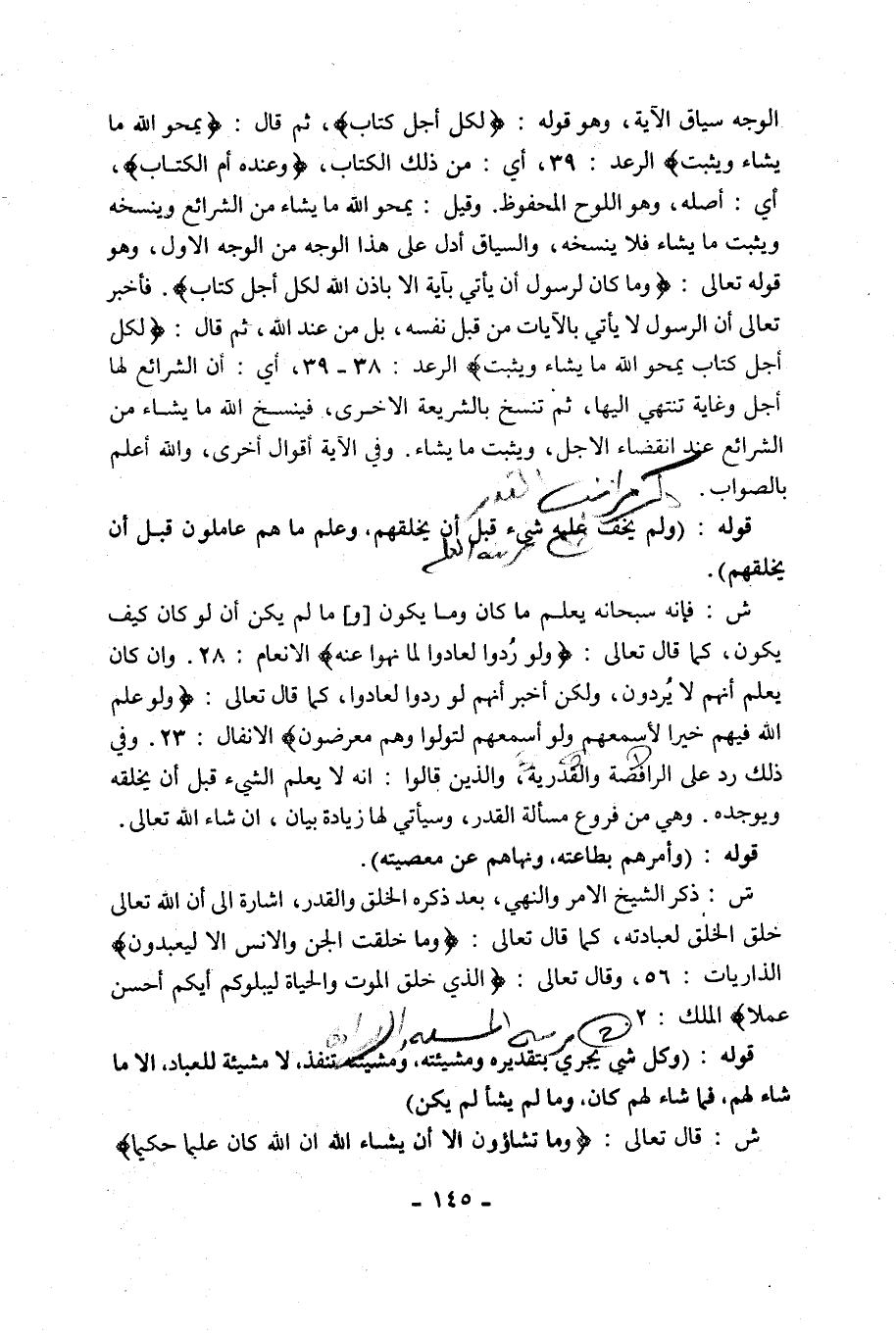 ش: فَإِنَّهُ سبحانه يعلم ما كان وما يكون [و] ما لَمْ يَكُنْ أَنْ لَوْ كَانَ كَيْفَ يَكُونُ، كَمَا قَالَ تَعَالَى: {وَلَوْ رُدُّوا لَعَادُوا لِمَا نُهُوا عَنْهُ} [سورة الْأَنْعَامِ: 28]. وَإِنْ كَانَ يَعْلَمُ أَنَّهُمْ لَا يُرَدُّونَ، وَلَكِنْ أَخْبَرَ أَنَّهُمْ لَوْ رُدُّوا لَعَادُوا، كَمَا قَالَ تَعَالَى: {وَلَوْ عَلِمَ اللَّهُ فِيهِمْ خَيْرًا لَأَسْمَعَهُمْ وَلَوْ أَسْمَعَهُمْ لَتَوَلَّوْا وَهُمْ مُعْرِضُونَ} [سورة الْأَنْفَالِ: 23]. وَفِي ذَلِكَ رَدٌّ عَلَى الرَّافِضَةِ وَالْقَدَرِيَّةِ، وَالَّذِينَ قَالُوا: إِنَّهُ لَا يَعْلَمُ الشَّيْءَ قَبْلَ أَنْ يَخْلُقَهُ وَيُوجِدَهُ, وَهِيَ مِنْ فُرُوعِ مَسْأَلَةِ الْقَدَرِ، وَسَيَأْتِي لَهَا زِيَادَةُ بَيَانٍ، إِنْ شَاءَ اللَّهُ تَعَالَى.