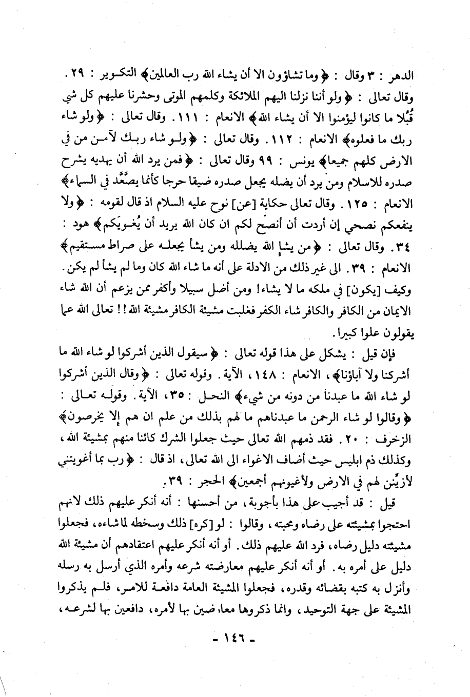 فَإِنْ قِيلَ: يُشْكِلُ عَلَى هَذَا قَوْلُهُ تَعَالَى: {سَيَقُولُ الَّذِينَ أَشْرَكُوا لَوْ شَاءَ اللَّهُ مَا أَشْرَكْنَا وَلَا آَبَاؤُنَا} [سورة الْأَنْعَامِ: 148] الْآيَةَ, وَقَوْلُهُ تَعَالَى: {وَقَالَ الَّذِينَ أَشْرَكُوا لَوْ شَاءَ اللَّهُ مَا عَبَدْنَا مِنْ دُونِهِ مِنْ شَيْءٍ} [سورة النَّحْلِ: 35]، الْآيَةَ. وَقَوْلُهُ تَعَالَى: {وَقَالُوا لَوْ شَاءَ الرَّحْمَنُ مَا عَبَدْنَاهُمْ مَا لَهُمْ بِذَلِكَ مِنْ عِلْمٍ إِنْ هُمْ إِلَّا يَخْرُصُونَ} [سورة الزُّخْرُفِ: 20]. فَقَدْ ذَمَّهُمُ اللَّهُ تَعَالَى حَيْثُ جَعَلُوا الشِّرْكَ كَائِنًا مِنْهُمْ بِمَشِيئَةِ اللَّهِ، وَكَذَلِكَ ذَمَّ إِبْلِيسَ حَيْثُ أَضَافَ الْإِغْوَاءَ إِلَى اللَّهِ تَعَالَى، إِذْ قَالَ: {رَبِّ بِمَا أَغْوَيْتَنِي لَأُزَيِّنَنَّ لَهُمْ فِي الْأَرْضِ وَلَأُغْوِيَنَّهُمْ أَجْمَعِينَ} [سورة الْحِجْرِ: 39].