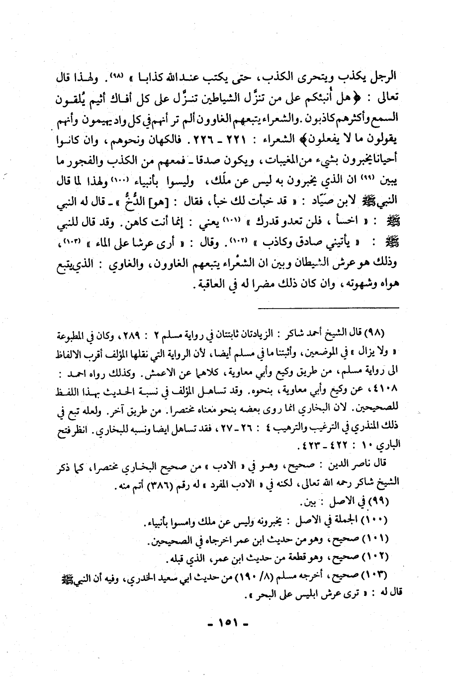 الرَّجُلُ يَكْذِبُ وَيَتَحَرَّى الْكَذِبَ، حَتَّى يُكْتَبَ عِنْدَ اللَّهِ كَذَّابًا" 1. وَلِهَذَا قَالَ تَعَالَى: {هَلْ أُنَبِّئُكُمْ عَلَى مَنْ تَنَزَّلُ الشَّيَاطِينُ، تَنَزَّلُ عَلَى كُلِّ أَفَّاكٍ أَثِيمٍ، يُلْقُونَ السَّمْعَ وَأَكْثَرُهُمْ كَاذِبُونَ، وَالشُّعَرَاءُ يَتَّبِعُهُمُ الْغَاوُونَ، أَلَمْ تَرَ أَنَّهُمْ فِي كُلِّ وَادٍ يَهِيمُونَ، وَأَنَّهُمْ يَقُولُونَ مَا لَا يَفْعَلُونَ} [سورة الشُّعَرَاءِ: 221 - 226]. فَالْكُهَّانُ وَنَحْوُهُمْ، وَإِنْ كَانُوا أَحْيَانًا يُخْبِرُونَ بشيء من المغيبات، وَيَكُونُ صِدْقًا, فَمَعَهُمْ مِنَ الْكَذِبِ وَالْفُجُورِ مَا يُبَيِّنُ2 أَنَّ الَّذِي يُخْبِرُونَ بِهِ لَيْسَ عَنْ مَلَكٍ، وَلَيْسُوا بِأَنْبِيَاءَ3, وَلِهَذَا لَمَّا قَالَ النَّبِيُّ صَلَّى اللَّهُ عَلَيْهِ وَسَلَّمَ لِابْنِ صَيَّادٍ: "قَدْ خبأت لك خبأ"، فَقَالَ: [هُوَ] الدُّخُّ", قَالَ لَهُ النَّبِيُّ صَلَّى اللَّهُ عَلَيْهِ وَسَلَّمَ: "اخْسَأْ، فَلَنْ تَعْدُوَ قَدْرَكَ" 4 يَعْنِي: إِنَّمَا أَنْتَ كَاهِنٌ. وَقَدْ قَالَ لِلنَّبِيِّ صَلَّى اللَّهُ عَلَيْهِ وَسَلَّمَ: "يَأْتِينِي صَادِقٌ وَكَاذِبٌ"5. وَقَالَ: "أَرَى عَرْشًا عَلَى الْمَاءِ"6، وَذَلِكَ هُوَ عَرْشُ الشَّيْطَانِ وَبَيَّنَ أَنَّ الشُّعَرَاءَ يَتَّبِعُهُمُ الْغَاوُونَ، وَالْغَاوِي: الَّذِي يَتَّبِعُ هَوَاهُ وَشَهْوَتَهُ، وَإِنْ كَانَ ذلك مضرا له في العاقبة.