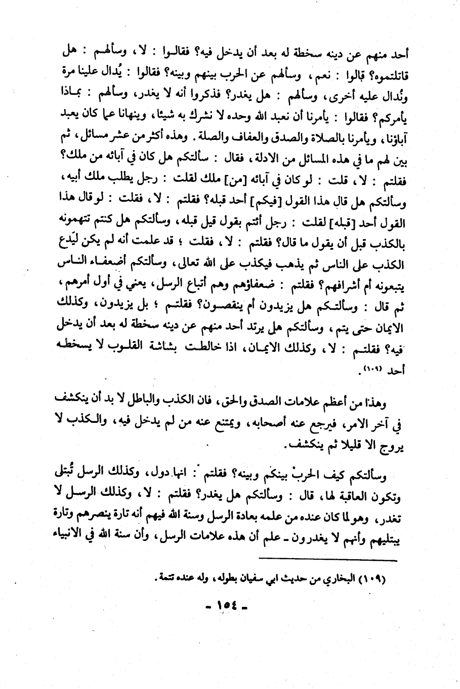 أَحَدٌ مِنْهُمْ عَنْ دِينِهِ سُخْطَةً لَهُ بَعْدَ أَنْ يَدْخُلَ فِيهِ؟ فَقَالُوا: لَا، وَسَأَلَهُمْ: هَلْ قَاتَلْتُمُوهُ؟ قَالُوا: نَعَمْ، وَسَأَلَهُمْ عَنِ الْحَرْبِ بَيْنَهُمْ وَبَيْنَهُ؟ فَقَالُوا: يُدَالُ عَلَيْنَا مَرَّةً وَنُدَالُ عَلَيْهِ أُخْرَى، وَسَأَلَهُمْ: هَلْ يَغْدِرُ؟ فَذَكَرُوا أَنَّهُ لَا يَغْدِرُ، وَسَأَلَهُمْ: بِمَاذَا يَأْمُرُكُمْ؟ فَقَالُوا: يَأْمُرُنَا أَنْ نَعْبُدَ اللَّهَ وَحْدَهُ لَا نُشْرِكَ بِهِ شَيْئًا، وَيَنْهَانَا عَمَّا كَانَ يَعْبُدُ آبَاؤُنَا، وَيَأْمُرُنَا بِالصَّلَاةِ وَالصِّدْقِ وَالْعَفَافِ وَالصِّلَةِ. وَهَذِهِ أَكْثَرُ مِنْ عَشْرِ مَسَائِلَ، ثُمَّ بَيَّنَ لَهُمْ مَا فِي هَذِهِ الْمَسَائِلِ مِنَ الْأَدِلَّةِ، فَقَالَ: سَأَلْتُكُمْ هَلْ كَانَ فِي آبَائِهِ مِنْ مَلِكٍ؟ فَقُلْتُمْ: لَا، قُلْتُ: لَوْ كَانَ فِي آبَائِهِ [مِنْ] مَلِكٍ لَقُلْتُ: رَجُلٌ يَطْلُبُ مُلْكَ أَبِيهِ، وَسَأَلْتُكُمْ هَلْ قَالَ هَذَا الْقَوْلَ [فِيكُمْ] أَحَدٌ قَبْلَهُ؟ فَقُلْتُمْ: لَا، فَقُلْتُ: لَوْ قَالَ هَذَا الْقَوْلَ أَحَدٌ [قَبْلَهُ] لَقُلْتُ: رَجُلٌ ائْتَمَّ بِقَوْلٍ قِيلَ قَبْلَهُ، وَسَأَلْتُكُمْ هَلْ كُنْتُمْ تَتَّهِمُونَهُ بِالْكَذِبِ قَبْلَ أَنْ يَقُولَ مَا قَالَ؟ فَقُلْتُمْ: لَا، فَقُلْتُ: قَدْ عَلِمْتُ أَنَّهُ لَمْ يَكُنْ لِيَدَعَ الْكَذِبَ عَلَى النَّاسِ ثم يذهب فيكذب على الله تعالى، وَسَأَلْتُكُمْ أَضُعَفَاءُ النَّاسِ يَتْبَعُونَهُ أَمْ أَشْرَافُهُمْ؟ فَقُلْتُمْ: ضُعَفَاؤُهُمْ وَهُمْ أَتْبَاعُ الرُّسُلِ، يَعْنِي فِي أَوَّلِ أَمْرِهِمْ، ثُمَّ قَالَ: وَسَأَلْتُكُمْ هَلْ يَزِيدُونَ أَمْ يَنْقُصُونَ؟ فَقُلْتُمْ، بَلْ يَزِيدُونَ، وَكَذَلِكَ الْإِيمَانُ حَتَّى يَتِمَّ، وَسَأَلْتُكُمْ هَلْ يَرْتَدُّ أَحَدٌ مِنْهُمْ عَنْ دِينِهِ سُخْطَةً لَهُ بَعْدَ أَنْ يَدْخُلَ فِيهِ؟ فَقُلْتُمْ: لَا، وَكَذَلِكَ الْإِيمَانُ، إِذَا خَالَطَتْ بَشَاشَتُةُ الْقُلُوبَ لَا يَسْخَطُهُ أَحَدٌ1.