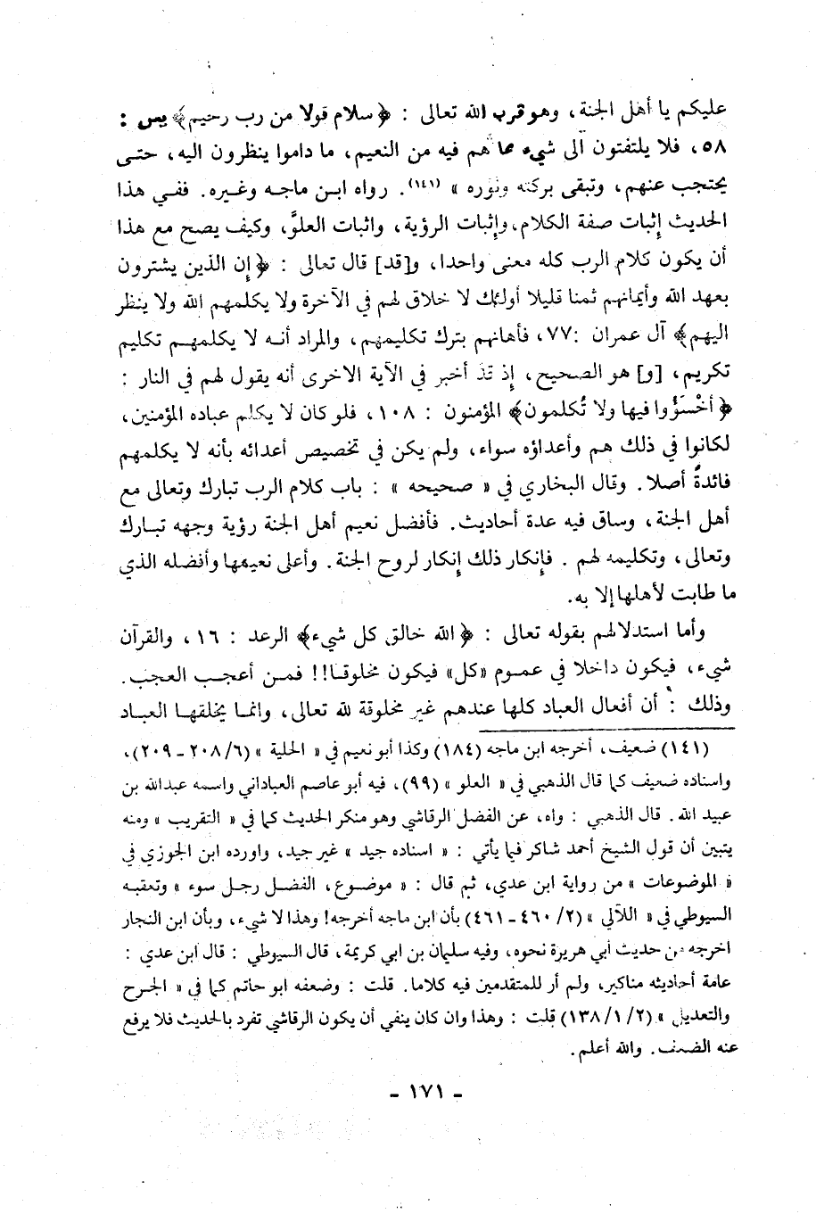 عَلَيْكُمْ يَا أَهْلَ الْجَنَّةِ، وَهُوَ قَوْلُ اللَّهِ تعالى: {سَلَامٌ قَوْلًا مِنْ رَبٍّ رَحِيم} [سورة يس: 58]، فَلَا يَلْتَفِتُونَ إِلَى شَيْءٍ مِمَّا هُمْ فِيهِ مِنَ النَّعِيمِ، مَا دَامُوا يَنْظُرُونَ إِلَيْهِ، حتى يحتجب عنهم، وتبقى بركته ونوره"1. رَوَاهُ ابْنُ مَاجَهْ وَغَيْرُهُ. فَفِي هَذَا الْحَدِيثِ إِثْبَاتُ صِفَةِ الْكَلَامِ، وَإِثْبَاتُ الرُّؤْيَةِ، وَإِثْبَاتُ الْعُلُوِّ، وَكَيْفَ يَصِحُّ مَعَ هَذَا أَنْ يَكُونَ كَلَامُ الرب كله معنى واحدا، و [قد] قَالَ تَعَالَى: {إِنَّ الَّذِينَ يَشْتَرُونَ بِعَهْدِ اللَّهِ وَأَيْمَانِهِمْ ثَمَنًا قَلِيلًا أُولَئِكَ لَا خَلَاقَ لَهُمْ فِي الْآَخِرَةِ وَلَا يُكَلِّمُهُمُ اللَّهُ وَلَا يَنْظُرُ إِلَيْهِمْ يَوْمَ الْقِيَامَةِ وَلَا يُزَكِّيهِمْ وَلَهُمْ عَذَابٌ أَلِيمٌ} [سورة آلِ عِمْرَانَ: 77]، فَأَهَانَهُمْ بِتَرْكِ تَكْلِيمِهِمْ، وَالْمُرَادُ أَنَّهُ لا يكلمهم تكليم تكريم، [و] هو الصَّحِيحُ، إِذْ قَدْ أَخْبَرَ فِي الْآيَةِ الْأُخْرَى أَنَّهُ يَقُولُ لَهُمْ فِي النَّارِ: {اخْسَئُوا فِيهَا وَلَا تُكَلِّمُونِ} [الْمُؤْمِنُونَ: 108]، فَلَوْ كَانَ لَا يُكَلِّمُ عِبَادَهُ الْمُؤْمِنِينَ، لَكَانُوا فِي ذَلِكَ هُمْ وَأَعْدَاؤُهُ سَوَاءً، وَلَمْ يَكُنْ فِي تَخْصِيصِ أَعْدَائِهِ بِأَنَّهُ لَا يُكَلِّمُهُمْ فَائِدَةٌ أَصْلًا. وَقَالَ الْبُخَارِيُّ فِي "صَحِيحِهِ": بَابُ كَلَامِ الرَّبِّ تَبَارَكَ وَتَعَالَى مَعَ أَهْلِ الْجَنَّةِ، وَسَاقَ فِيهِ عِدَّةَ أَحَادِيثَ. فَأَفْضَلُ نَعِيمِ أَهْلِ الْجَنَّةِ رُؤْيَةُ وَجْهِهِ تَبَارَكَ وَتَعَالَى، وَتَكْلِيمُهُ لَهُمْ. فَإِنْكَارُ ذَلِكَ إِنْكَارٌ لِرُوحِ الْجَنَّةِ, وَأَعْلَى نَعِيمِهَا وَأَفْضَلِهِ الَّذِي مَا طَابَتْ لِأَهْلِهَا إِلَّا بِهِ.
