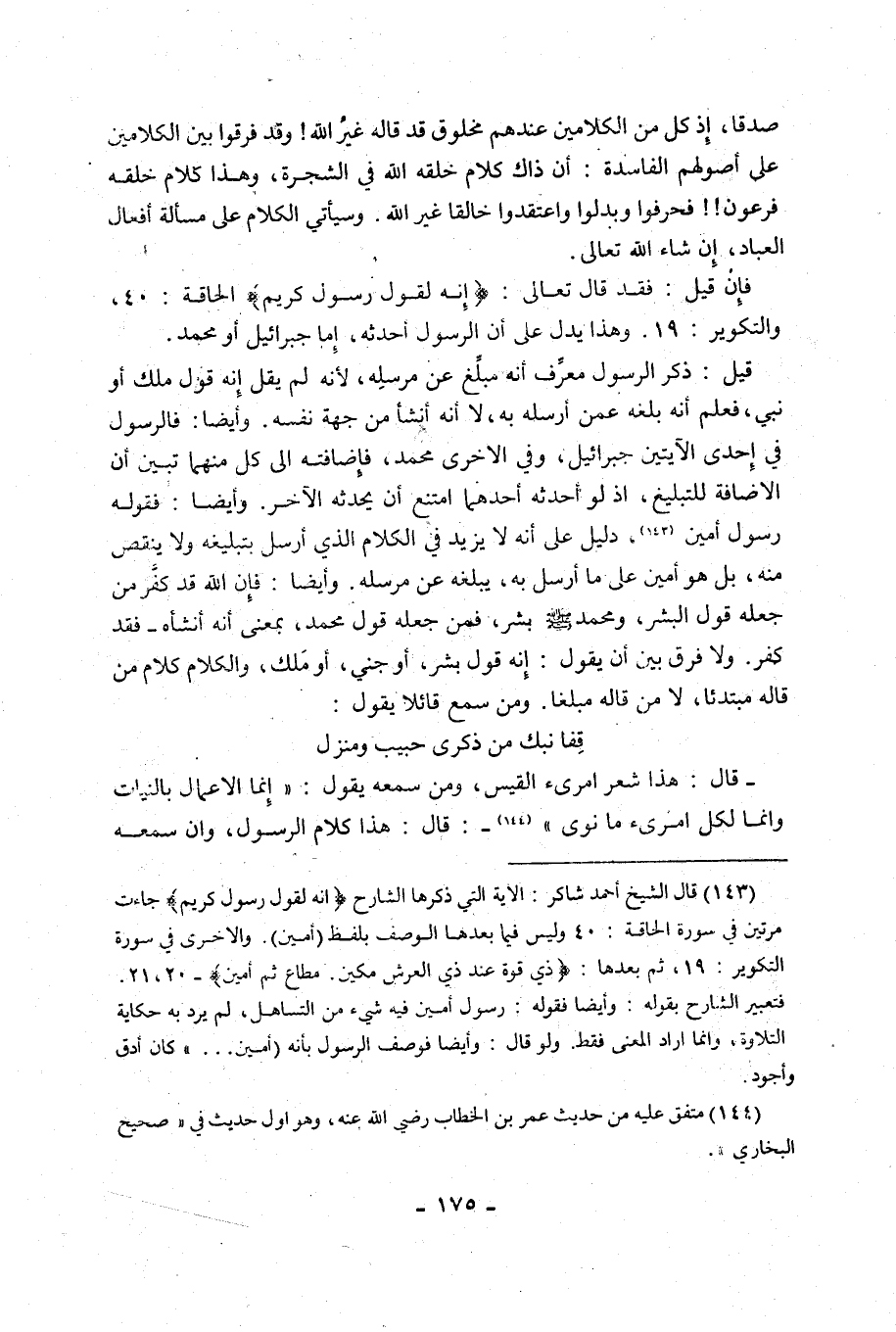 1 قال الشيخ أحمد شاكر: الآية التي ذكرها الشارح {إِنَّهُ لَقَوْلُ رَسُولٍ كَرِيمٍ} جاءت مرتين في سورة الحاقة: 40, وليست فيما بعدها الوصف بلفظ "أمين". والأخرى في سورة التكوير: 19, ثم بعدها: {ذِي قُوَّةٍ عِنْدَ ذِي الْعَرْشِ مَكِينٍ, مُطَاعٍ ثَمَّ أَمِينٍ} [20، 21] , فتعبير الشارح بقوله: "وأيضا فقوله: رسول أمين". فيه شيء من التساهل، لم يرد به حكاية التلاوة، وإنما أراد المعنى فقط, ولو قال: "وأيضا فوصف الرسول بأنه أمين ... " كان أدق وأجود.