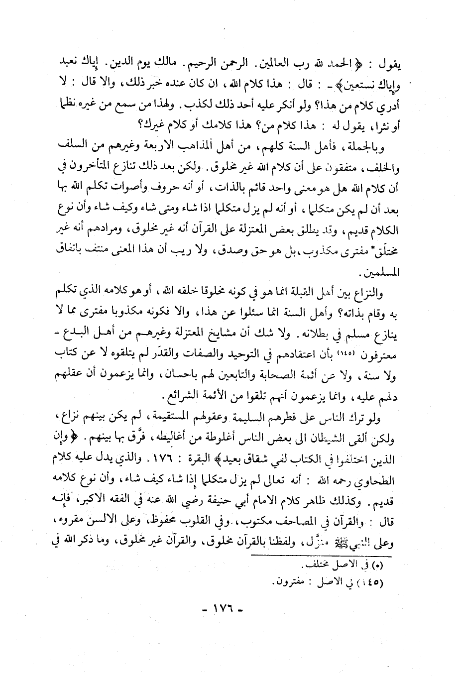 وَلَوْ تُرِكَ النَّاسُ عَلَى فِطَرِهِمُ السَّلِيمَةِ وَعُقُولِهِمُ الْمُسْتَقِيمَةِ، لَمْ يَكُنْ بَيْنَهُمْ نِزَاعٌ، وَلَكِنْ أَلْقَى الشَّيْطَانُ إِلَى بَعْضِ النَّاسِ أُغْلُوطَةً مِنْ أَغَالِيطِهِ، فَرَّقَ بِهَا بَيْنَهُمْ. {وَإِنَّ الَّذِينَ اخْتَلَفُوا فِي الْكِتَابِ لَفِي شِقَاقٍ بَعِيدٍ} [سورة الْبَقَرَةِ: 176] , وَالَّذِي يَدُلُّ عَلَيْهِ كَلَامُ الطَّحَاوِيِّ رَحِمَهُ اللَّهُ: أَنَّهُ تَعَالَى لَمْ يَزَلْ مُتَكَلِّمًا إِذَا شَاءَ كَيْفَ شَاءَ، وَأَنَّ نَوْعَ كَلَامِهِ قَدِيمٌ. وَكَذَلِكَ ظَاهِرُ كَلَامِ الْإِمَامِ أَبِي حَنِيفَةَ رَضِيَ اللَّهُ عَنْهُ فِي الْفِقْهِ الْأَكْبَرِ، فَإِنَّهُ قَالَ: والقرآن فِي الْمَصَاحِفِ مَكْتُوبٌ، وَفِي الْقُلُوبِ مَحْفُوظٌ، وَعَلَى الْأَلْسُنِ مَقْرُوءٌ، وَعَلَى النَّبِيِّ صَلَّى اللَّهُ عَلَيْهِ وسلم منزل، ولفظنا بالقرآن مخلوق، والقرآن غير مخلوق، وما ذكر الله في