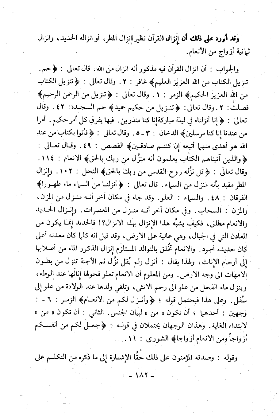 وَالْجَوَابُ: أَنَّ إِنْزَالَ الْقُرْآنِ فِيهِ مَذْكُورٌ أَنَّهُ إِنْزَالٌ مِنَ اللَّهِ, قَالَ تَعَالَى: {حم، تَنْزِيلُ الْكِتَابِ مِنَ اللَّهِ الْعَزِيزِ الْعَلِيمِ} [سورة غَافِرٍ: 2]. وَقَالَ تَعَالَى: {تَنْزِيلُ الْكِتَابِ مِنَ اللَّهِ الْعَزِيزِ الْحَكِيمِ} [الزُّمَرِ: 1]. وَقَالَ تَعَالَى: {تَنْزِيلٌ مِنَ الرَّحْمَنِ الرَّحِيمِ} [فُصِّلَتْ: 2]. وَقَالَ تَعَالَى: {تَنْزِيلٌ مِنْ حَكِيمٍ حَمِيدٍ} [السجدة: 42]. وقال تعالى: {إِنَّا أَنْزَلْنَاهُ فِي لَيْلَةٍ مُبَارَكَةٍ إِنَّا كُنَّا مُنْذِرِينَ، فِيهَا يُفْرَقُ كُلُّ أَمْرٍ حَكِيمٍ، أَمْرًا مِنْ عِنْدِنَا إِنَّا كُنَّا مُرْسِلِينَ} [الدُّخَانِ: 3 - 5]. وَقَالَ تَعَالَى: {فَأْتُوا بِكِتَابٍ مِنْ عِنْدِ اللَّهِ هُوَ أَهْدَى مِنْهُمَا أَتَّبِعْهُ إِنْ كُنْتُمْ صَادِقِينَ} [الْقَصَصِ: 49]. وَقَالَ تَعَالَى: {وَالَّذِينَ آَتَيْنَاهُمُ الْكِتَابَ يَعْلَمُونَ أَنَّهُ مُنَزَّلٌ مِنْ رَبِّكَ بِالْحَقِّ} [الْأَنْعَامِ: 114]. وَقَالَ تَعَالَى: {قُلْ نَزَّلَهُ رُوحُ الْقُدُسِ مِنْ رَبِّكَ بِالْحَقِّ} [النَّحْلِ: 102]. وَإِنْزَالُ الْمَطَرِ مُقَيَّدٌ بِأَنَّهُ مُنَزَّلٌ مِنَ السَّمَاءِ. قَالَ تَعَالَى: {أَنْزَلْنَا مِنَ السَّمَاءِ مَاءً طَهُورًا} [الفرقان: 48]. وَالسَّمَاءُ: الْعُلُوُّ. وَقَدْ جَاءَ فِي مَكَانٍ آخَرَ أَنَّهُ مُنَزَّلٌ مِنَ الْمُزْنِ، وَالْمُزْنُ: السَّحَابُ. وَفِي مَكَانٍ آخَرَ أَنَّهُ مُنَزَّلٌ مِنَ الْمُعْصِرَاتِ. وَإِنْزَالُ الحديد والأنعام مطلق، فكيف يشبه هذا الْإِنْزَالُ بِهَذَا الْإِنْزَالِ؟! فَالْحَدِيدُ إِنَّمَا يَكُونُ مِنَ الْمَعَادِنِ الَّتِي فِي الْجِبَالِ، وَهِيَ عَالِيَةٌ عَلَى الْأَرْضِ، وَقَدْ قِيلَ: إِنَّهُ كُلَّمَا كَانَ مَعْدِنُهُ أَعْلَى كَانَ حَدِيدُهُ أَجْوَدَ. وَالْأَنْعَامُ تُخْلَقُ بِالتَّوَالُدِ الْمُسْتَلْزِمِ إِنْزَالَ الذُّكُورِ الْمَاءَ مِنْ أَصْلَابِهَا إِلَى أرحام الإناث، ولهذا يقال: أنزل, ولم يقل: نزل ثُمَّ الْأَجِنَّةُ تَنْزِلُ مِنْ بُطُونِ الْأُمَّهَاتِ إِلَى وَجْهِ الْأَرْضِ. وَمِنَ الْمَعْلُومِ أَنَّ الْأَنْعَامَ تَعْلُو فُحُولُهَا إِنَاثَهَا عِنْدَ الْوَطْءِ، وَيَنْزِلُ مَاءُ الْفَحْلِ مِنْ عُلْوٍ إِلَى رَحِمِ الْأُنْثَى، وَتُلْقِي وَلَدَهَا عِنْدَ الْوِلَادَةِ مِنْ عُلْوٍ إِلَى سُفْلٍ. وَعَلَى هَذَا فَيُحْتَمَلُ قَوْلُهُ، {وَأَنْزَلَ لَكُمْ مِنَ الْأَنْعَامِ} [الزُّمَرِ: 6] وَجْهَيْنِ: أَحَدُهُمَا: أَنْ تَكُونَ "مِنْ" لِبَيَانِ الْجِنْسِ. الثَّانِي: أَنْ تَكُونَ "مِنْ" لِابْتِدَاءِ الْغَايَةِ, وَهَذَانَ الْوَجْهَانِ يُحْتَمَلَانِ فِي قَوْلِهِ: {جَعَلَ لَكُمْ مِنْ أَنْفُسِكُمْ أَزْوَاجًا وَمِنَ الْأَنْعَامِ أَزْوَاجًا} [الشُّورَى: 11].