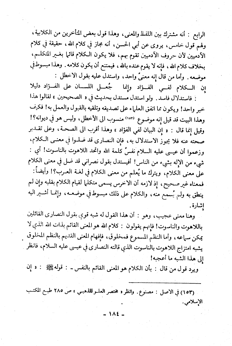 فَاسْتِدْلَالٌ فَاسِدٌ, وَلَوِ اسْتَدَلَّ مُسْتَدِلٌّ بِحَدِيثٍ فِي الصَّحِيحَيْنِ لَقَالُوا هَذَا خَبَرٌ وَاحِدٌ! وَيَكُونُ مِمَّا اتَّفَقَ الْعُلَمَاءُ عَلَى تَصْدِيقِهِ وَتَلَقِّيهِ بِالْقَبُولِ وَالْعَمَلِ بِهِ! فَكَيْفَ وَهَذَا الْبَيْتُ قَدْ قِيلَ إِنَّهُ مَوْضُوعٌ1 مَنْسُوبٌ إِلَى الْأَخْطَلِ، وَلَيْسَ هُوَ فِي دِيوَانِهِ؟! وَقِيلَ إِنَّمَا قَالَ: "إِنَّ الْبَيَانَ لَفِي الْفُؤَادِ وَهَذَا أَقْرَبُ إِلَى الصِّحَّةِ، وَعَلَى تَقْدِيرِ صِحَّتِهِ عَنْهُ فَلَا يَجُوزُ الِاسْتِدْلَالُ بِهِ، فَإِنَّ النَّصَارَى قَدْ ضَلُّوا فِي مَعْنَى الْكَلَامِ، وَزَعَمُوا أَنَّ عِيسَى عَلَيْهِ السَّلَامُ نَفْسُ كَلِمَةِ اللَّهِ وَاتَّحَدَ اللَّاهُوتُ بِالنَّاسُوتِ! أَيْ: شَيْءٌ مِنَ الْإِلَهِ بِشَيْءٍ مِنَ النَّاسِ! أَفَيُسْتَدَلُّ بِقَوْلِ نَصْرَانِيٍّ قَدْ ضَلَّ فِي مَعْنَى الْكَلَامِ عَلَى مَعْنَى الْكَلَامِ، وَيُتْرَكُ مَا يُعْلَمُ مِنْ مَعْنَى الْكَلَامِ فِي لُغَةِ الْعَرَبِ؟! وَأَيْضًا: فَمَعْنَاهُ غَيْرُ صَحِيحٍ، إِذْ لَازِمُهُ أَنَّ الْأَخْرَسَ يُسَمَّى مُتَكَلِّمًا لِقِيَامِ الْكَلَامِ بِقَلْبِهِ وَإِنْ لَمْ يَنْطِقْ بِهِ وَلَمْ يُسْمَعْ مِنْهُ، وَالْكَلَامُ عَلَى ذَلِكَ مَبْسُوطٌ فِي مَوْضِعِهِ، وَإِنَّمَا أُشِيرُ إِلَيْهِ إِشَارَةً.