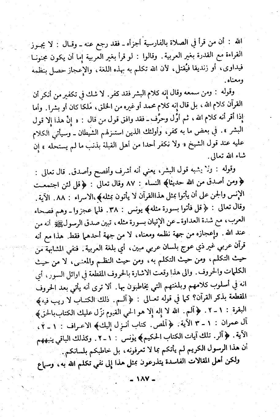 اللَّهُ: أَنَّ مَنْ قَرَأَ فِي الصَّلَاةِ بِالْفَارِسِيَّةِ أَجْزَأَهُ -فَقَدْ رَجَعَ عَنْهُ- وَقَالَ: لَا يَجُوزُ الْقِرَاءَةُ مَعَ الْقُدْرَةِ بِغَيْرِ الْعَرَبِيَّةِ. وَقَالُوا: لَوْ قرأ بغير العربية إما أَنْ يَكُونَ مَجْنُونًا فَيُدَاوَى، أَوْ زِنْدِيقًا فَيُقْتَلَ، لِأَنَّ اللَّهَ تَكَلَّمَ بِهِ بِهَذِهِ اللُّغَةِ، وَالْإِعْجَازُ حَصَلَ بِنَظْمِهِ وَمَعْنَاهُ.