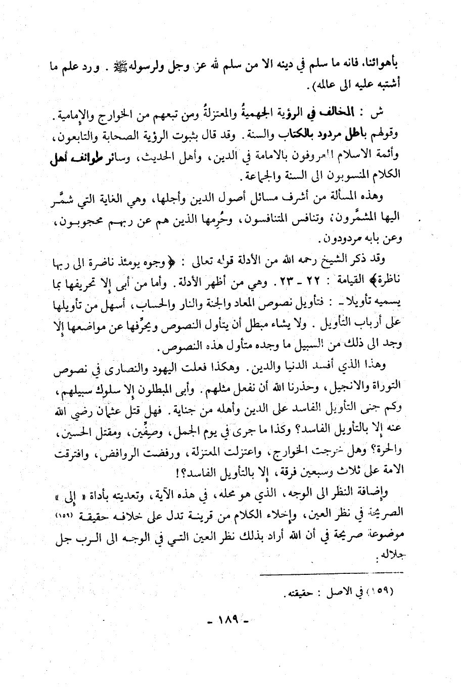وَقَدْ ذَكَرَ الشَّيْخُ رَحِمَهُ اللَّهُ مِنَ الْأَدِلَّةِ قَوْلَهُ تَعَالَى: {وُجُوهٌ يَوْمَئِذٍ نَاضِرَةٌ، إِلَى رَبِّهَا نَاظِرَةٌ} [الْقِيَامَةِ: 22, 23]. وَهِيَ مِنْ أَظْهَرِ الْأَدِلَّةِ, وَأَمَّا مَنْ أَبَى إِلَّا تَحْرِيفَهَا بِمَا يُسَمِّيهِ تَأْوِيلًا؛ فَتَأْوِيلُ نُصُوصِ الْمَعَادِ وَالْجَنَّةِ وَالنَّارِ وَالْحِسَابِ، أَسْهَلُ مِنْ تَأْوِيلِهَا عَلَى أَرْبَابِ التَّأْوِيلِ, وَلَا يَشَاءُ مُبْطِلٌ أَنْ يَتَأَوَّلَ النُّصُوصَ وَيُحَرِّفَهَا عَنْ مَوَاضِعِهَا إِلَّا وَجَدَ إِلَى ذَلِكَ مِنَ السَّبِيلِ مَا وَجَدَهُ مُتَأَوِّلُ هَذِهِ النُّصُوصِ.