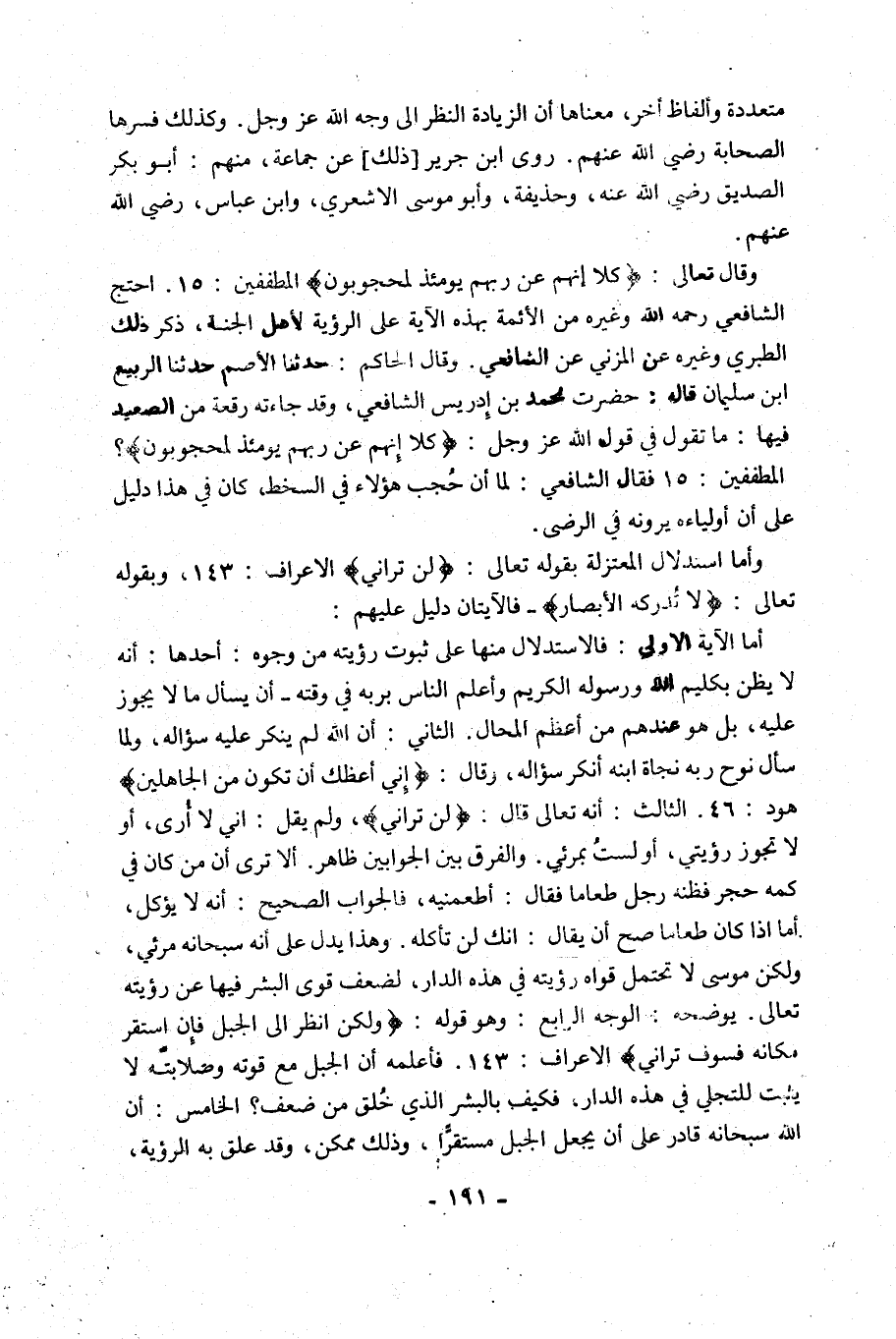 وَقَالَ تَعَالَى: {كَلاَّ إِنَّهُمْ عَنْ رَبِّهِمْ يَوْمَئِذٍ لَمَحْجُوبُونَ} [الْمُطَفِّفِينَ: 15]. احْتَجَّ الشَّافِعِيُّ رَحِمَهُ اللَّهُ وَغَيْرُهُ مِنَ الْأَئِمَّةِ بِهَذِهِ الْآيَةِ عَلَى الرُّؤْيَةِ لِأَهْلِ الْجَنَّةِ، ذَكَرَ ذَلِكَ الطَّبَرِيُّ وَغَيْرُهُ عَنِ الْمُزَنِيِّ عَنِ الشَّافِعِيِّ, وَقَالَ الْحَاكِمُ: حَدَّثَنَا الْأَصَمُّ حَدَّثَنَا الرَّبِيعُ بْنُ سُلَيْمَانَ قَالَ: حَضَرْتُ مُحَمَّدَ بْنَ إِدْرِيسَ الشَّافِعِيَّ، وَقَدْ جَاءَتْهُ رُقْعَةٌ مِنَ الصَّعِيدِ فِيهَا: مَا تَقُولُ فِي قَوْلِ اللَّهِ عَزَّ وَجَلَّ: {كَلاَّ إِنَّهُمْ عَنْ رَبِّهِمْ يَوْمَئِذٍ لَمَحْجُوبُونَ}؟ [الْمُطَفِّفِينَ: 15] فَقَالَ الشَّافِعِيُّ: لَمَّا أَنَّ حُجِبَ هَؤُلَاءِ فِي السُّخْطِ، كَانَ فِي هَذَا دَلِيلٌ عَلَى أَنَّ أَوْلِيَاءَهُ يرونه في الرضى.