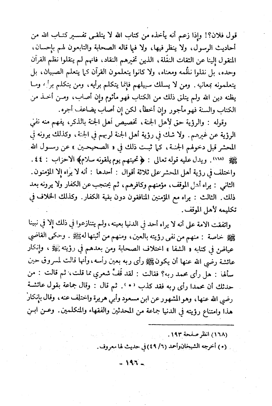 وَاتَّفَقَتِ الْأُمَّةُ عَلَى أَنَّهُ لَا يَرَاهُ أَحَدٌ فِي الدُّنْيَا بِعَيْنِهِ، وَلَمْ يَتَنَازَعُوا فِي ذَلِكَ إِلَّا فِي نَبِيِّنَا صَلَّى اللَّهُ عَلَيْهِ وَسَلَّمَ خَاصَّةً: مِنْهُمْ مَنْ نَفَى رُؤْيَتَهُ بِالْعَيْنِ، وَمِنْهُمْ مَنْ أَثْبَتَهَا لَهُ صَلَّى اللَّهُ عَلَيْهِ وَسَلَّمَ, وَحَكَى الْقَاضِي عِيَاضٌ فِي كِتَابِهِ الشِّفَا اخْتِلَافَ الصحابة وَمَنْ بَعْدَهُمْ فِي رُؤْيَتِهِ صَلَّى اللَّهُ عَلَيْهِ وَسَلَّمَ، وَإِنْكَارَ عَائِشَةَ رَضِيَ اللَّهُ عَنْهَا أَنْ يَكُونَ صَلَّى اللَّهُ عَلَيْهِ وَسَلَّمَ رَأَى رَبَّهُ بِعَيْنِ رَأْسِهِ، وَأَنَّهَا قَالَتْ لِمَسْرُوقٍ حِينَ سَأَلَهَا: هَلْ رَأَى مُحَمَّدٌ رَبَّهُ؟ فَقَالَتْ: لَقَدْ قَفَّ شِعْرِي مِمَّا قُلْتَ، ثُمَّ قَالَتْ: مَنْ حَدَّثَكَ أَنَّ مُحَمَّدًا رَأَى رَبَّهُ فَقَدْ كَذَبَ2. ثُمَّ قَالَ: وَقَالَ جَمَاعَةٌ بِقَوْلِ عَائِشَةَ رَضِيَ اللَّهُ عنها، وهو المشهور عن ابن مسعود وأبي هُرَيْرَةَ وَاخْتُلِفَ عَنْهُ، وَقَالَ بِإِنْكَارِ هَذَا وَامْتِنَاعِ رُؤْيَتِهِ فِي الدُّنْيَا جَمَاعَةٌ مِنَ الْمُحَدِّثِينَ وَالْفُقَهَاءِ والمتكلمين. وعن ابن
