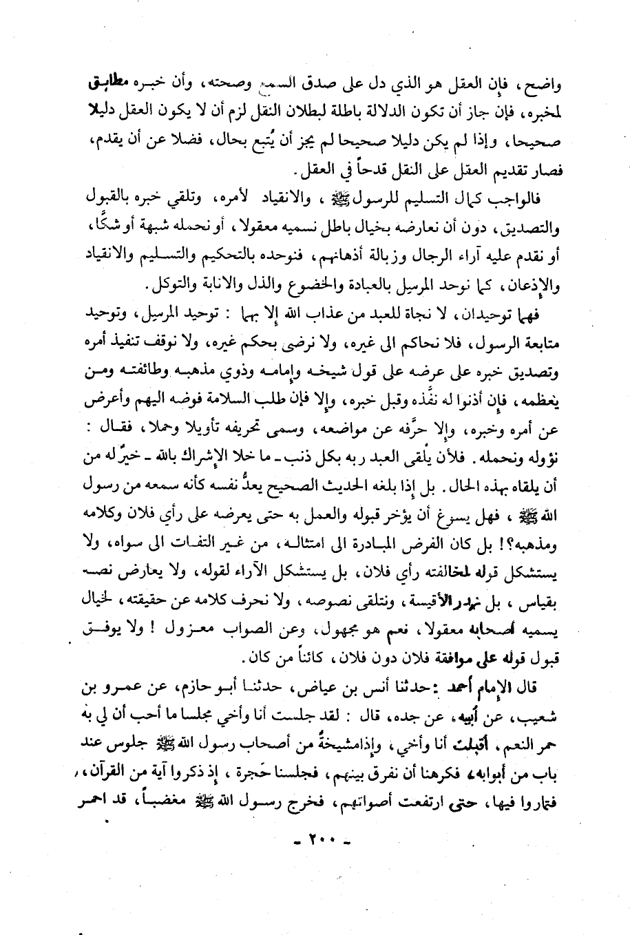 فَالْوَاجِبُ كَمَالُ التَّسْلِيمِ لِلرَّسُولِ صَلَّى اللَّهُ عَلَيْهِ وَسَلَّمَ، وَالْانْقِيَادُ لِأَمْرِهِ، وَتَلَقِّي خَبَرَهُ بالقبول والتصديق، دون أن نعارضه بخيال باطل نسميه معقولا، أو نحمله شبهة أو شكا، أو نقدم عليه آراء الرجال وزبالة أذهانهم، فنوحده بالتحكيم والتسليم والانقياد والإذعان، كما نوحد المرسل بالعبادة والخصوع وَالذُّلِّ وَالْإِنَابَةِ وَالتَّوَكُّلِ.