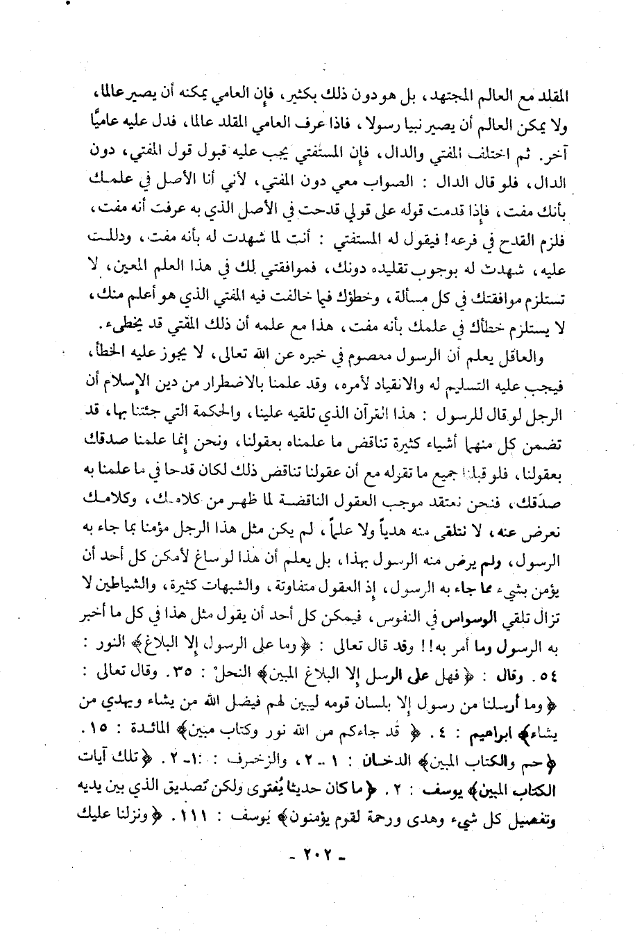 وَالْعَاقِلُ يَعْلَمُ أَنَّ الرَّسُولَ مَعْصُومٌ فِي خَبَرِهِ عَنِ اللَّهِ تَعَالَى، لَا يَجُوزُ عَلَيْهِ الْخَطَأُ، فَيَجِبُ عَلَيْهِ التَّسْلِيمُ لَهُ وَالْانْقِيَادُ لِأَمْرِهِ، وَقَدْ عَلِمْنَا بِالْاضْطِرَارِ مِنْ دِينِ الْإِسْلَامِ أَنَّ الرَّجُلَ لَوْ قَالَ لِلرَّسُولِ: هَذَا الْقُرْآنُ الَّذِي تُلْقِيهِ عَلَيْنَا، وَالْحِكْمَةُ الَّتِي جِئْتَنَا بِهَا، قَدْ تَضَمَّنَ كُلٌّ مِنْهُمَا أَشْيَاءَ كَثِيرَةً تُنَاقِضُ مَا عَلِمْنَاهُ بِعُقُولِنَا، وَنَحْنُ إِنَّمَا عِلِمْنَا صِدْقَكَ بِعُقُولِنَا، فَلَوْ قَبِلْنَا جَمِيعَ مَا تَقُولُهُ مَعَ أَنَّ عُقُولَنَا تُنَاقِضُ ذَلِكَ لَكَانَ قَدْحًا فِي مَا عَلِمْنَا بِهِ صِدْقَكَ، فَنَحْنُ نَعْتَقِدُ مُوجِبَ العقول الناقضة لِمَا ظَهَرَ مِنْ كَلَامِكَ، وَكَلَامُكَ نُعْرِضُ عَنْهُ، لَا نَتَلَقَّى مِنْهُ هَدْيًا وَلَا عِلْمًا، لَمْ يَكُنْ مِثْلُ هَذَا الرَّجُلِ مُؤْمِنًا بِمَا جَاءَ بِهِ الرَّسُولُ، وَلَمْ يَرْضَ مِنْهُ الرَّسُولُ بِهَذَا، بَلْ يَعْلَمُ أَنَّ هَذَا لَوْ سَاغَ لَأَمْكَنَ كل أحد أن يُؤْمِنَ بِشَيْءٍ مِمَّا جَاءَ بِهِ الرَّسُولُ، إِذِ الْعُقُولُ مُتَفَاوِتَةٌ، وَالشُّبُهَاتٌ كَثِيرَةٌ، وَالشَّيَاطِينُ لَا تَزَالُ تلقي الوسواس فِي النُّفُوسِ، فَيُمْكِنُ كُلُّ أَحَدٍ أَنْ يَقُولَ مِثْلَ هَذَا فِي كُلِّ مَا أَخْبَرَ بِهِ الرَّسُولُ وَمَا أَمَرَ بِهِ!! وَقَدْ قَالَ تَعَالَى: {وَمَا عَلَى الرَّسُولِ إِلَّا الْبَلَاغُ} [النُّورِ: 54]. وَقَالَ: {فَهَلْ عَلَى الرُّسُلِ إِلَّا الْبَلَاغُ الْمُبِينُ} [النَّحْلِ: 35]. وَقَالَ تَعَالَى: {وَمَا أَرْسَلْنَا مِنْ رَسُولٍ إِلَّا بِلِسَانِ قَوْمِهِ لِيُبَيِّنَ لَهُمْ فَيُضِلُّ اللَّهُ مَنْ يَشَاءُ وَيَهْدِي مَنْ يَشَاءُ} [إِبْرَاهِيمَ: 4]. {قَدْ جَاءَكُمْ مِنَ اللَّهِ نُورٌ وَكِتَابٌ مُبِينٌ} [الْمَائِدَةِ: 15]. {حم، وَالْكِتَابِ الْمُبِينِ} [الدخان: 1, 2]. {تِلْكَ آَيَاتُ الْكِتَابِ الْمُبِينِ} [يُوسُفَ: 2]. {مَا كَانَ حَدِيثًا يُفْتَرَى وَلَكِنْ تَصْدِيقَ الَّذِي بَيْنَ يَدَيْهِ وَتَفْصِيلَ كُلِّ شَيْءٍ وَهُدًى وَرَحْمَةً لِقَوْمٍ يُؤْمِنُونَ} [يُوسُفَ: 111]. {وَنَزَّلْنَا عَلَيْكَ