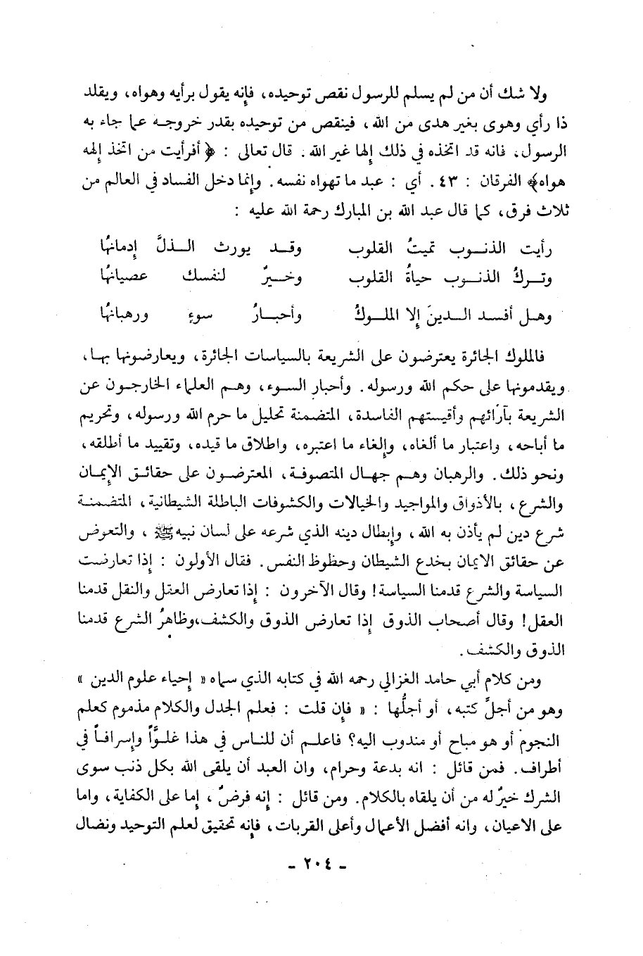 وَلَا شَكَّ أَنَّ مَنْ لَمْ يُسَلِّمْ لِلرَّسُولِ نقص توحيده، فإنه يقول برأيه وهواه، ويقلد ذَا رَأْيٍ وَهَوًى بِغَيْرِ هُدًى مِنَ اللَّهِ، فَيَنْقُصُ مِنْ تَوْحِيدِهِ بِقَدْرِ خُرُوجِهِ عَمَّا جَاءَ بِهِ الرَّسُولُ، فَإِنَّهُ قَدِ اتَّخَذَهُ فِي ذَلِكَ إِلَهًا غَيْرَ اللَّهِ. قَالَ تَعَالَى: {أَفَرَأَيْتَ مَنِ اتَّخَذَ إِلَهَهُ هَوَاهُ} [الفرقان: 43]. أَيْ: عَبَدَ مَا تَهْوَاهُ نَفْسُهُ. وَإِنَّمَا دَخَلَ الْفَسَادُ فِي الْعَالَمِ مِنْ ثَلَاثِ فِرَقٍ، كَمَا قَالَ عَبْدُ اللَّهِ بْنُ الْمُبَارَكِ رَحْمَةُ اللَّهِ عَلَيْهِ: