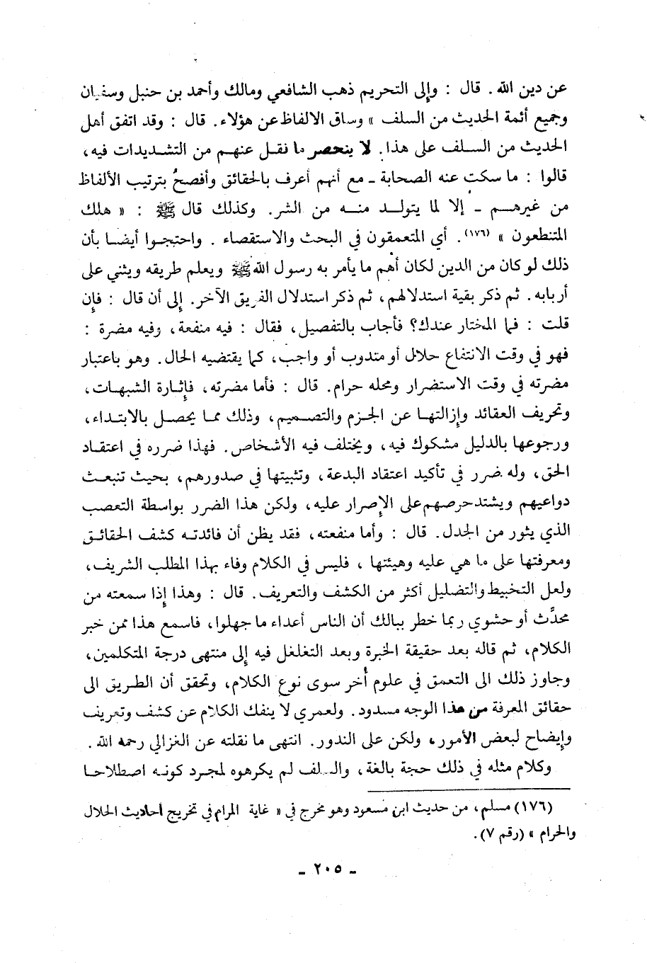 عَنْ دِينِ اللَّهِ. قَالَ: وَإِلَى التَّحْرِيمِ ذَهَبَ الشَّافِعِيُّ وَمَالِكٌ وَأَحْمَدُ بْنُ حَنْبَلٍ وَسُفْيَانُ وَجَمِيعُ أَئِمَّةِ الْحَدِيثِ مِنَ السَّلَفِ وَسَاقَ الْأَلْفَاظَ عَنْ هَؤُلَاءِ. قَالَ: وَقَدِ اتَّفَقَ أَهْلُ الْحَدِيثِ مِنَ السَّلَفِ عَلَى هَذَا. لَا يَنْحَصِرُ مَا نُقِلَ عَنْهُمْ مِنَ التَّشْدِيدَاتِ فِيهِ، قَالُوا: مَا سَكَتَ عَنْهُ الصَّحَابَةُ مَعَ أَنَّهُمْ أَعْرَفُ بِالْحَقَائِقِ وَأَفْصَحُ بِتَرْتِيبِ الْأَلْفَاظِ مِنْ غَيْرِهِمْ إِلَّا لِمَا يَتَوَلَّدُ منه من الشر. وكذلك قال صَلَّى اللَّهُ عَلَيْهِ وَسَلَّمَ: "هَلَكَ الْمُتَنَطِّعُونَ" 1. أَيِ الْمُتَعَمِّقُونَ فِي الْبَحْثِ وَالْاسْتِقْصَاءِ. وَاحْتَجُّوا أَيْضًا بِأَنَّ ذَلِكَ لَوْ كَانَ مِنَ الدِّينِ لَكَانَ أَهَمَّ مَا يَأْمُرُ بِهِ رَسُولُ اللَّهِ صَلَّى اللَّهُ عَلَيْهِ وَسَلَّمَ وَيُعْلَمُ طَرِيقُهُ وَيُثْنِي عَلَى أَرْبَابِهِ. ثُمَّ ذَكَرَ بَقِيَّةَ اسْتِدْلَالِهِمْ، ثُمَّ ذَكَرَ اسْتِدْلَالَ الْفَرِيقِ الْآخَرِ. إِلَى أَنْ قَالَ: فَإِنْ قُلْتَ: فَمَا الْمُخْتَارُ عِنْدَكَ؟ فَأَجَابَ بِالتَّفْصِيلِ، فَقَالَ: فِيهِ مَنْفَعَةٌ، وَفِيهِ مَضَرَّةٌ: فَهُوَ فِي وَقْتِ الْانْتِفَاعِ حَلَالٌ أَوْ مَنْدُوبٌ أَوْ وَاجِبٌ، كَمَا يَقْتَضِيهِ الْحَالُ. وَهُوَ بِاعْتِبَارِ مَضَرَّتِهِ فِي وَقْتِ الْاسْتِضْرَارِ وَمَحِلِّهِ حَرَامٌ. قَالَ: فَأَمَّا مَضَرَّتُهُ، فَإِثَارَةُ الشُّبُهَاتِ، وَتَحْرِيفُ الْعَقَائِدِ وَإِزَالَتُهَا عَنِ الْجَزْمِ وَالتَّصْمِيمِ، وَذَلِكَ مِمَّا يَحْصُلُ بِالْابْتِدَاءِ، وَرُجُوعُهَا بِالدَّلِيلِ مَشْكُوكٌ فِيهِ، وَيَخْتَلِفُ فِيهِ الْأَشْخَاصُ. فَهَذَا ضَرَرُهُ فِي اعْتِقَادِ الْحَقِّ، وَلَهُ ضَرَرٌ فِي تَأْكِيدِ اعْتِقَادِ الْبِدْعَةِ، وَتَثْبِيتِهَا فِي صُدُورِهِمْ، بِحَيْثُ تَنْبَعِثُ دَوَاعِيهِمْ وَيَشْتَدُّ حِرْصُهُمْ عَلَى الْإِصْرَارِ عَلَيْهِ، وَلَكِنَّ هَذَا الضَّرَرَ بِوَاسِطَةِ التَّعَصُّبِ الَّذِي يَثُورُ مِنَ الْجَدَلِ. قَالَ: وَأَمَّا مَنْفَعَتُهُ، فَقَدْ يُظَنُّ أَنَّ فَائِدَتَهُ كَشْفُ الحقائق ومعرفتها على ما هي عليه وهيئتها، فَلَيْسَ فِي الْكَلَامِ وَفَاءٌ بِهَذَا الْمَطْلَبِ الشَّرِيفِ، ولعل التخبيط والتضليل أَكْثَرُ مِنَ الْكَشْفِ وَالتَّعْرِيفِ. قَالَ: وَهَذَا إِذَا سَمِعْتَهُ مِنْ مُحَدِّثٍ أَوْ حَشْوِيٍّ رُبَّمَا خَطَرَ بِبَالِكَ أَنَّ النَّاسَ أَعْدَاءُ مَا جَهِلُوا، فَاسْمَعْ هَذَا مِمَّنْ خَبَرَ الْكَلَامَ، ثُمَّ قَالَهُ بَعْدَ حَقِيقَةِ الْخِبْرَةِ وَبَعْدَ التَّغَلْغُلِ فِيهِ إِلَى مُنْتَهَى دَرَجَةِ الْمُتَكَلِّمِينَ، وَجَاوَزَ ذَلِكَ إِلَى التَّعَمُّقِ فِي عُلُومٍ أُخَرَ سِوَى نَوْعِ الْكَلَامِ، وَتَحَقَّقَ أَنَّ الطَّرِيقَ إِلَى حَقَائِقِ الْمَعْرِفَةِ مِنْ هَذَا الْوَجْهِ مَسْدُودٌ. وَلَعَمْرِي لَا يَنْفَكُّ الْكَلَامُ عَنْ كَشْفٍ وَتَعْرِيفٍ وَإِيضَاحٍ لِبَعْضِ الْأُمُورِ، وَلَكِنْ عَلَى النُّدُورِ. انْتَهَى مَا نَقَلْتُهُ عَنِ الْغَزَالِيِّ رَحِمَهُ اللَّهُ.