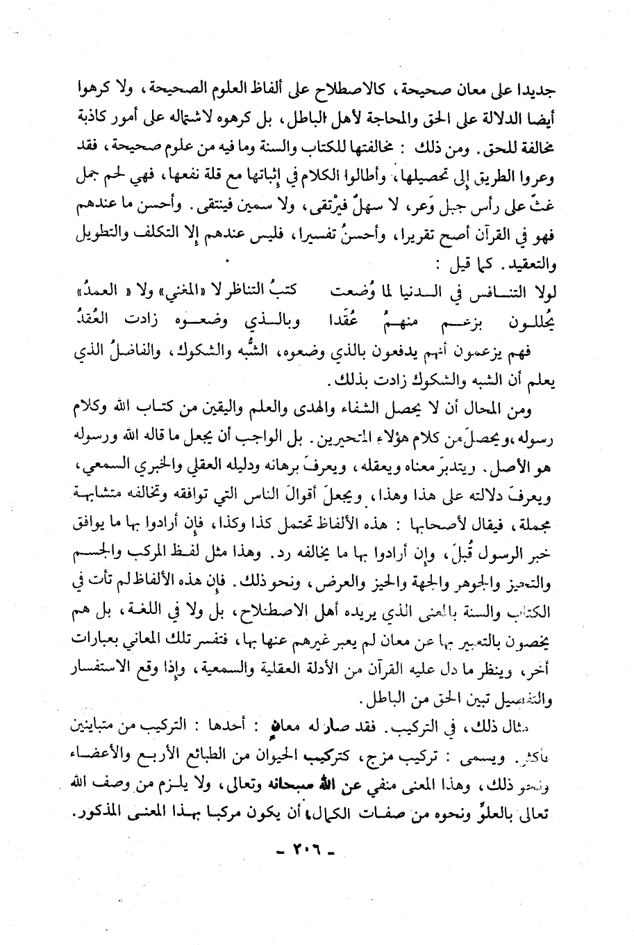 وَمِنَ الْمُحَالِ أَنْ لَا يَحْصُلَ الشِّفَاءُ وَالْهُدَى وَالْعِلْمُ وَالْيَقِينُ مِنْ كِتَابِ اللَّهِ وَكَلَامِ رَسُولِهِ، وَيَحْصُلَ مِنْ كَلَامِ هَؤُلَاءِ الْمُتَحَيِّرِينَ. بَلِ الْوَاجِبُ أَنْ يَجْعَلَ مَا قَالَهُ اللَّهُ وَرَسُولُهُ هُوَ الْأَصْلُ، وَيَتَدَبَّرَ مَعْنَاهُ وَيَعْقِلَهُ، وَيَعْرِفَ بُرْهَانَهُ وَدَلِيلَهُ العقلي والخبري السَّمْعِيُّ، وَيَعْرِفَ دَلَالَتَهُ عَلَى هَذَا وَهَذَا، وَيَجْعَلَ أَقْوَالَ النَّاسِ الَّتِي تُوَافِقُهُ وَتُخَالِفُهُ مُتَشَابِهَةً مُجْمَلَةً، فَيُقَالُ لِأَصْحَابِهَا: هَذِهِ الْأَلْفَاظُ تَحْتَمِلُ كَذَا وَكَذَا، فَإِنْ أَرَادُوا بِهَا مَا يُوَافِقُ خَبَرَ الرَّسُولِ قُبِلَ، وَإِنْ أَرَادُوا بِهَا مَا يُخَالِفُهُ رُدَّ. وهذا مثل لفظ المركب والجسم والتحيز وَالْجَوْهَرِ وَالْجِهَةِ وَالْحَيِّزِ وَالْعَرَضِ، وَنَحْوِ ذَلِكَ. فَإِنَّ هَذِهِ الْأَلْفَاظَ لَمْ تَأْتِ فِي الْكِتَابِ وَالسُّنَّةِ بِالْمَعْنَى الَّذِي يُرِيدُهُ أَهْلُ الْاصْطِلَاحِ، بَلْ وَلَا في اللغة، بل هم يخصون بِالتَّعْبِيرِ بِهَا عَنْ مَعَانٍ لَمْ يُعَبِّرْ غَيْرُهُمْ عَنْهَا بِهَا، فَتُفَسَّرُ تِلْكَ الْمَعَانِي بِعِبَارَاتٍ أُخَرَ، وَيُنْظَرُ مَا دَلَّ عَلَيْهِ الْقُرْآنُ مِنَ الْأَدِلَّةِ الْعَقْلِيَّةِ وَالسَّمْعِيَّةِ، وَإِذَا وَقَعَ الِاسْتِفْسَارُ وَالتَّفْصِيلُ تَبَيَّنَ الْحَقُّ مِنَ الْبَاطِلِ.