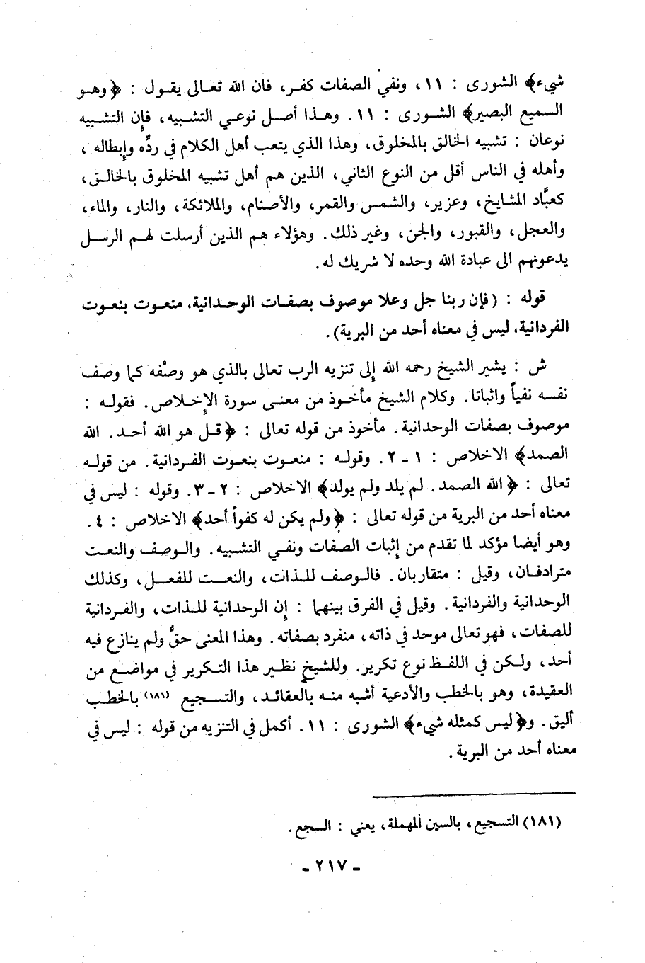 ش: يُشِيرُ الشَّيْخُ رَحِمَهُ اللَّهُ إِلَى تَنْزِيهِ الرَّبِّ تَعَالَى بِالَّذِي هُوَ وَصْفُهُ كَمَا وَصَفَ نَفْسَهُ نَفْيًا وَإِثْبَاتًا, وَكَلَامُ الشَّيْخِ مَأْخُوذٌ مِنْ مَعْنَى سُورَةِ الْإِخْلَاصِ, فَقَوْلُهُ: مَوْصُوفٌ بِصِفَاتِ الْوَحْدَانِيَّةِ مَأْخُوذٌ مِنْ قَوْلِهِ تَعَالَى: {قُلْ هُوَ اللَّهُ أَحَدٌ، اللَّهُ الصَّمَدُ} [الإخلاص: 1, 2]. وَقَوْلُهُ: مَنْعُوتٌ بِنُعُوتِ الْفَرْدَانِيَّةِ مِنْ قَوْلِهِ تَعَالَى: {اللَّهُ الصَّمَدُ، لَمْ يَلِدْ وَلَمْ يُولَدْ} [الإخلاص: 2, 3]. وَقَوْلُهُ: لَيْسَ فِي مَعْنَاهُ أَحَدٌ مِنَ الْبَرِيَّةِ مِنْ قَوْلِهِ تَعَالَى: {وَلَمْ يَكُنْ لَهُ كُفُوًا أَحَدٌ} [الإخلاص: 4]. وَهُوَ أَيْضًا مُؤَكِّدٌ لِمَا تَقَدَّمَ مِنْ إِثْبَاتِ الصِّفَاتِ وَنَفْيِ التَّشْبِيهِ, وَالْوَصْفُ وَالنَّعْتُ مُتَرَادِفَانِ، وَقِيلَ: مُتَقَارِبَانِ. فَالْوَصْفُ لِلَذَّاتِ، وَالنَّعْتُ لِلْفِعْلِ، وَكَذَلِكَ الْوَحْدَانِيَّةُ وَالْفَرْدَانِيَّةُ, وَقِيلَ فِي الْفَرْقِ بَيْنَهُمَا: إِنَّ الْوَحْدَانِيَّةَ للذات، والفردانية للصفات، فهو تعالى موحد في ذاته، منفرد بِصِفَاتِهِ, وَهَذَا الْمَعْنَى حَقٌّ وَلَمْ يُنَازِعْ فِيهِ أَحَدٌ، وَلَكِنْ فِي اللَّفْظِ نَوْعُ تَكْرِيرٍ, وَلِلشَّيْخِ نَظِيرُ هَذَا التَّكْرِيرِ فِي مَوَاضِعَ مِنَ الْعَقِيدَةِ، وَهُوَ بِالْخُطَبِ وَالْأَدْعِيَةِ أَشْبَهُ مِنْهُ بِالْعَقَائِدِ، وَالتَّسْجِيعُ1 بِالْخُطَبِ أَلْيَقُ. وَ {لَيْسَ كَمِثْلِهِ شَيْءٌ} [الشُّورَى: 11]. أَكْمَلُ فِي التَّنْزِيهِ مِنْ قَوْلِهِ: لَيْسَ فِي معناه أحد من البرية.