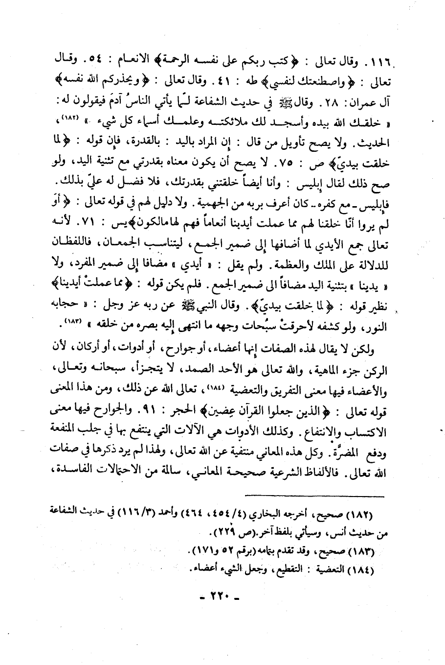 وَقَالَ تَعَالَى: {كَتَبَ رَبُّكُمْ عَلَى نَفْسِهِ الرَّحْمَةَ} [الْأَنْعَامِ: 54]. وَقَالَ تَعَالَى: {وَاصْطَنَعْتُكَ لِنَفْسِي} [طَهَ: 41]. وَقَالَ تَعَالَى: {وَيُحَذِّرُكُمُ اللَّهُ نَفْسَهُ} [آلِ عِمْرَانَ: 28]. وَقَالَ صَلَّى اللَّهُ عَلَيْهِ وَسَلَّمَ فِي حَدِيثِ الشَّفَاعَةِ لَمَّا يَأْتِي النَّاسُ آدَمَ فَيَقُولُونَ لَهُ: "خَلَقَكَ اللَّهُ بِيَدِهِ وَأَسْجَدَ لَكَ مَلَائِكَتَهُ وَعَلَّمَكَ أَسْمَاءَ كُلِّ شَيْءٍ" 1، الْحَدِيثَ. وَلَا يَصِحُّ تَأْوِيلُ مَنْ قال: إن المراد باليد: بالقدرة، فَإِنَّ قَوْلَهُ: {لِمَا خَلَقْتُ بِيَدَيَّ} [ص: 75]. لَا يَصِحُّ أَنْ يَكُونَ مَعْنَاهُ بِقُدْرَتِي مَعَ تَثْنِيَةِ الْيَدِ، وَلَوْ صَحَّ ذَلِكَ لَقَالَ إِبْلِيسُ: وَأَنَا أَيْضًا خَلَقْتَنِي بِقُدْرَتِكَ، فَلَا فَضْلَ لَهُ عَلَيَّ بِذَلِكَ. فَإِبْلِيسُ -مَعَ كُفْرِهِ- كَانَ أَعْرَفَ بِرَبِّهِ مِنَ الْجَهْمِيَّةِ, وَلَا دَلِيلَ لَهُمْ فِي قَوْلِهِ تَعَالَى: {أَوَلَمْ يَرَوْا أَنَّا خَلَقْنَا لَهُمْ مِمَّا عَمِلَتْ أَيْدِينَا أَنْعَامًا فَهُمْ لَهَا مَالِكُونَ} [يس: 71]؛ لِأَنَّهُ تَعَالَى جَمْعَ الْأَيْدِي لَمَّا أَضَافَهَا إِلَى ضَمِيرِ الْجَمْعِ، لِيَتَنَاسَبَ الْجَمْعَانِ، فَاللَّفْظَانِ لِلدَّلَالَةِ عَلَى الملك والعظمة, ولم يقل: أيدي مضافا إِلَى ضَمِيرِ الْمُفْرَدِ، وَلَا يَدَيْنَا بِتَثْنِيَةِ الْيَدِ مضافا إِلَى ضَمِيرِ الْجَمْعِ, فَلَمْ يَكُنْ قَوْلُهُ: {مِمَّا عَمِلَتْ أَيْدِينَا} نَظِيرَ قَوْلِهِ: {لِمَا خَلَقْتُ بِيَدَي}. وَقَالَ النَّبِيُّ صَلَّى اللَّهُ عَلَيْهِ وَسَلَّمَ عَنْ رَبِّهِ عَزَّ وَجَلَّ: "حِجَابُهُ النُّورُ، وَلَوْ كَشَفَهُ لَأَحْرَقَتْ سُبُحَاتُ وَجْهِهِ مَا انْتَهَى إِلَيْهِ بَصَرُهُ مِنْ خَلْقِهِ" 2.