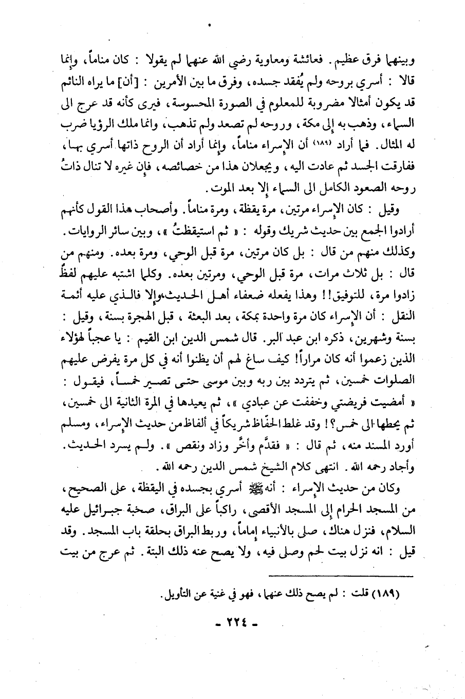 وَقِيلَ: كَانَ الْإِسْرَاءُ مَرَّتَيْنِ، مَرَّةً يَقَظَةً، وَمَرَّةً مَنَامًا, وَأَصْحَابُ هَذَا الْقَوْلِ كَأَنَّهُمْ أَرَادُوا الْجَمْعَ بَيْنَ حَدِيثِ شَرِيكٍ وَقَوْلِهِ: ثُمَّ "اسْتَيْقَظْتُ"، وَبَيْنَ سَائِرِ الرِّوَايَاتِ. وَكَذَلِكَ مِنْهُمْ مَنْ قَالَ: بَلْ كَانَ مَرَّتَيْنِ، مَرَّةً قَبْلَ الْوَحْيِ، وَمَرَّةً بَعْدَهُ, وَمِنْهُمْ مَنْ قَالَ: بَلْ ثَلَاثَ مَرَّاتٍ، مَرَّةً قَبْلَ الْوَحْيِ، وَمَرَّتَيْنِ بَعْدَهُ, وَكُلَّمَا اشْتَبَهَ عَلَيْهِمْ لَفْظٌ زَادُوا مَرَّةً، لِلتَّوْفِيقِ!! وَهَذَا يَفْعَلُهُ ضُعَفَاءُ أَهْلِ الْحَدِيثِ، وَإِلَّا فَالَّذِي عَلَيْهِ أَئِمَّةُ النَّقْلِ: أَنَّ الْإِسْرَاءَ كَانَ مَرَّةً وَاحِدَةً بِمَكَّةَ، بَعْدَ الْبِعْثَةِ، قَبْلَ الْهِجْرَةِ بِسَنَةٍ، وَقِيلَ: بِسَنَةٍ وَشَهْرَيْنِ، ذَكَرَهُ ابْنُ عَبْدِ الْبَرِّ, قَالَ شَمْسُ الدِّينِ ابْنُ الْقَيِّمِ: يَا عَجَبًا لِهَؤُلَاءِ الَّذِينَ زَعَمُوا أَنَّهُ كَانَ مِرَارًا! كَيْفَ سَاغَ لَهُمْ أَنْ يَظُنُّوا أَنَّهُ فِي كُلِّ مَرَّةٍ يفرض عَلَيْهِمُ الصَّلَوَاتُ خَمْسِينَ، ثُمَّ يَتَرَدَّدُ بَيْنَ رَبِّهِ وَبَيْنَ مُوسَى حَتَّى تَصِيرَ خَمْسًا، فَيَقُولُ: أَمْضَيْتُ فَرِيضَتِي وَخَفَّفْتُ عَنْ عِبَادِي، ثُمَّ يُعِيدُهَا فِي الْمَرَّةِ الثَّانِيَةِ إِلَى خَمْسِينَ، ثُمَّ يَحُطُّهَا إِلَى خَمْسٍ؟! وَقَدْ غَلَّطَ الْحُفَّاظُ شَرِيكًا فِي أَلْفَاظٍ مِنْ حَدِيثِ الْإِسْرَاءِ، وَمُسْلِمٌ أَوْرَدَ الْمُسْنَدَ مِنْهُ، ثُمَّ قَالَ: "فَقَدَّمَ وَأَخَّرَ وَزَادَ وَنَقَصَ", وَلَمْ يَسْرُدِ الْحَدِيثَ, وَأَجَادَ رَحِمَهُ اللَّهُ. انْتَهَى كَلَامُ الشَّيْخِ شَمْسُ الدِّينِ رَحِمَهُ اللَّهُ.