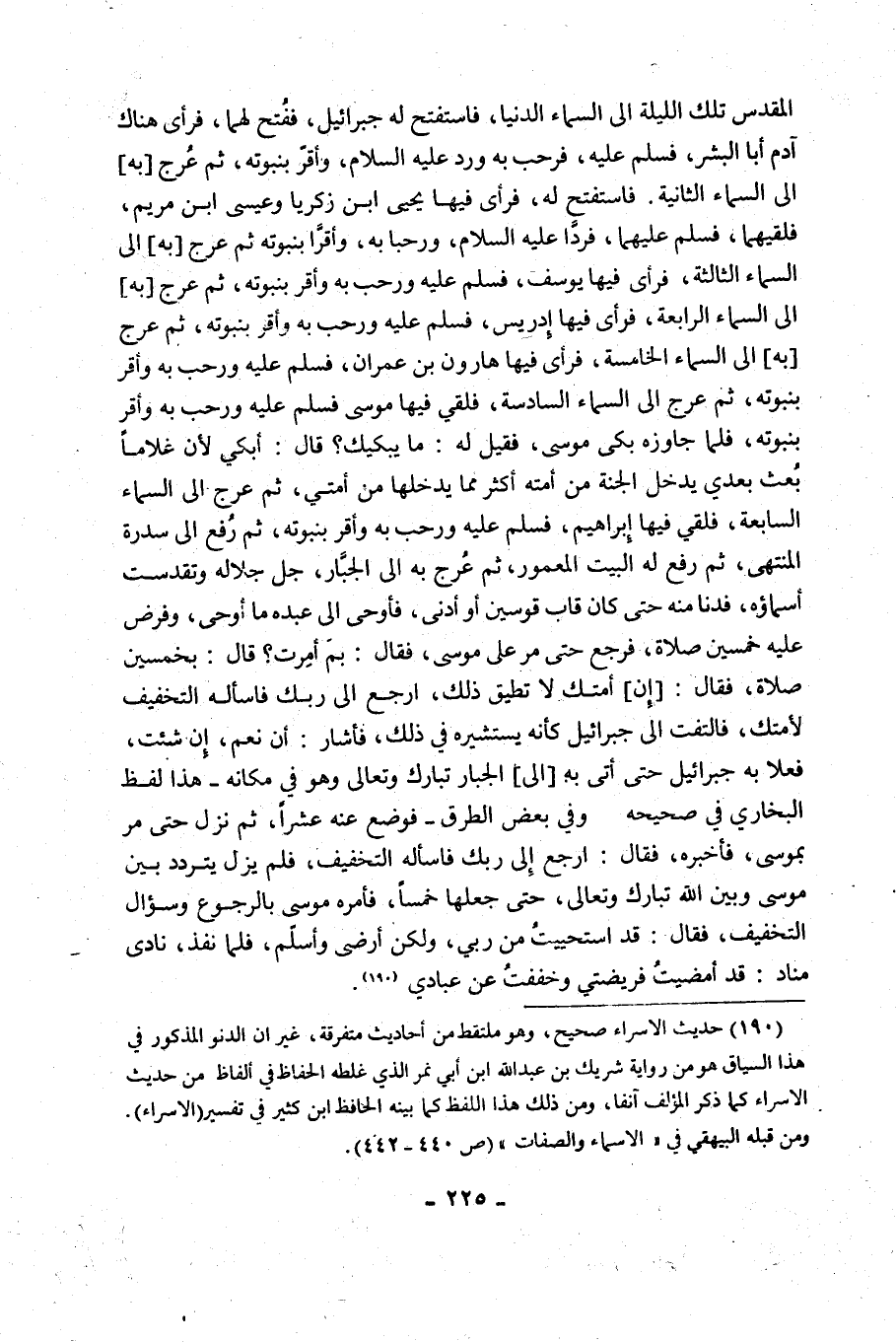 الْمَقْدِسِ تِلْكَ اللَّيْلَةَ إِلَى السَّمَاءِ الدُّنْيَا، فَاسْتَفْتَحَ له جبرائيل، فَفُتِحَ لَهُمَا، فَرَأَى هُنَاكَ آدَمَ أَبَا الْبَشَرِ، فَسَلَّمَ عَلَيْهِ، فَرَحَّبَ بِهِ وَرَدَّ عَلَيْهِ السَّلَامَ، وَأَقَرَّ بِنُبُوَّتِهِ، ثُمَّ عُرِجَ [بِهِ] إِلَى السَّمَاءِ الثَّانِيَةِ. فَاسْتَفْتَحَ لَهُ، فَرَأَى فِيهَا يَحْيَى بْنَ زَكَرِيَّا وَعِيسَى ابْنَ مَرْيَمَ، فَلَقِيَهُمَا، فَسَلَّمَ عَلَيْهِمَا، فَرَدَّا عَلَيْهِ السَّلَامَ، وَرَحَّبَا بِهِ، وَأَقَرَّا بِنُبُوَّتِهِ ثُمَّ عُرِجَ [بِهِ] إِلَى السَّمَاءِ الثَّالِثَةِ، فَرَأَى فيها يوسف، فَسَلَّمَ عَلَيْهِ وَرَحَّبَ بِهِ وَأَقَرَّ بِنُبُوَّتِهِ، ثُمَّ عُرِجَ [بِهِ] إِلَى السَّمَاءِ الرَّابِعَةِ، فَرَأَى فِيهَا إِدْرِيسَ، فَسَلَّمَ عَلَيْهِ وَرَحَّبَ بِهِ وَأَقَرَّ بِنُبُوَّتِهِ، ثُمَّ عُرِجَ [بِهِ] إِلَى السَّمَاءِ الْخَامِسَةِ، فَرَأَى فِيهَا هَارُونَ بْنَ عِمْرَانَ، فَسَلَّمَ عَلَيْهِ وَرَحَّبَ به وأقر بنبوته، ثم عرج إِلَى السَّمَاءِ السَّادِسَةِ، فَلَقِيَ فِيهَا مُوسَى فَسَلَّمَ عَلَيْهِ وَرَحَّبَ بِهِ وَأَقَرَّ بِنُبُوَّتِهِ، فَلَمَّا جَاوَزَهُ بَكَى مُوسَى، فَقِيلَ لَهُ: مَا يُبْكِيكَ؟ قَالَ: أَبْكِي لِأَنَّ غُلَامًا بُعِثَ بَعْدِي يَدْخُلُ الْجَنَّةَ مِنْ أُمَّتِهِ أَكْثَرُ مِمَّا يَدْخُلُهَا مِنْ أُمَّتِي، ثم عرج إِلَى السَّمَاءِ السَّابِعَةِ، فَلَقِيَ فِيهَا إِبْرَاهِيمَ، فَسَلَّمَ عَلَيْهِ وَرَحَّبَ بِهِ وَأَقَرَّ بِنُبُوَّتِهِ، ثُمَّ رُفِعَ إِلَى سِدْرَةِ الْمُنْتَهَى، ثُمَّ رُفِعَ لَهُ الْبَيْتُ الْمَعْمُورُ، ثُمَّ عُرِجَ بِهِ إِلَى الْجَبَّارِ، جَلَّ جَلَالُهُ وَتَقَدَّسَتْ أَسْمَاؤُهُ، فَدَنَا مِنْهُ حَتَّى كَانَ قَابَ قَوْسَيْنِ أَوْ أَدْنَى، فَأَوْحَى إِلَى عَبْدِهِ مَا أَوْحَى، وَفَرَضَ عَلَيْهِ خَمْسِينَ صَلَاةً، فَرَجَعَ حَتَّى مَرَّ عَلَى مُوسَى، فَقَالَ: بِمَ أُمِرْتَ؟ قَالَ: "بِخَمْسِينَ صَلَاةً"، فَقَالَ: [إِنَّ] أُمَّتَكَ لَا تُطِيقُ ذَلِكَ، ارْجِعْ إِلَى رَبِّكَ فَاسْأَلْهُ التَّخْفِيفَ لِأُمَّتِكَ، فَالْتَفَتَ إِلَى جَبْرَائِيلَ كَأَنَّهُ يَسْتَشِيرُهُ فِي ذَلِكَ، فَأَشَارَ: أَنْ نَعَمْ، إِنْ شِئْتَ، فَعَلَا به جبرائيل حَتَّى أَتَى بِهِ [إِلَى] الْجَبَّارِ تَبَارَكَ وَتَعَالَى وَهُوَ فِي مَكَانِهِ -هَذَا لَفْظُ الْبُخَارِيِّ فِي صَحِيحِهِ وَفِي بَعْضِ الطُّرُقِ- فَوَضَعَ عَنْهُ عَشْرًا، ثُمَّ نَزَلَ حَتَّى مَرَّ بِمُوسَى، فَأَخْبَرَهُ، فَقَالَ: ارْجِعْ إِلَى رَبِّكَ فَاسْأَلْهُ التَّخْفِيفَ، فَلَمْ يَزَلْ يَتَرَدَّدُ بَيْنَ مُوسَى وَبَيْنَ اللَّهِ تَبَارَكَ وَتَعَالَى، حَتَّى جَعَلَهَا خَمْسًا، فَأَمَرَهُ مُوسَى بِالرُّجُوعِ وَسُؤَالِ التَّخْفِيفِ، فَقَالَ: "قَدِ اسْتَحْيَيْتُ مِنْ رَبِّي، وَلَكِنْ أَرْضَى وَأُسَلِّمُ"، فَلَمَّا نَفَذَ، نَادَى مُنَادٍ: قَدْ أمضيت فريضتي وخففت عن عبادي1.