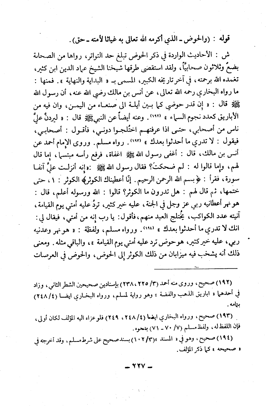 ش: الْأَحَادِيثُ الْوَارِدَةُ فِي ذِكْرِ الْحَوْضِ تَبْلُغُ حَدَّ التَّوَاتُرِ، رَوَاهَا مِنَ الصَّحَابَةِ بِضْعٌ وَثَلَاثُونَ صَحَابِيًّا، وَلَقَدِ اسْتَقْصَى طُرُقَهَا شيخنا الشيخ عماد الدين ابن كَثِيرٍ، تَغَمَّدَهُ اللَّهُ بِرَحْمَتِهِ، فِي آخِرِ تَارِيخِهِ الْكَبِيرِ، الْمُسَمَّى بِـ"الْبِدَايَةِ وَالنِّهَايَةِ". فَمِنْهَا: مَا رَوَاهُ الْبُخَارِيُّ رَحِمَهُ اللَّهُ تَعَالَى، عَنْ أَنَسِ بْنِ مَالِكٍ رَضِيَ اللَّهُ عَنْهُ، أَنَّ رَسُولَ اللَّهِ صَلَّى اللَّهُ عَلَيْهِ وَسَلَّمَ قَالَ: "إِنَّ قَدْرَ حَوْضِي كَمَا بَيْنَ أَيْلَةَ إِلَى صَنْعَاءَ مِنَ الْيَمَنِ، وَإِنَّ فِيهِ مِنَ الْأَبَارِيقِ كَعَدَدِ نُجُومِ السَّمَاءِ" 1, وَعَنْهُ أَيْضًا عَنِ النَّبِيِّ صَلَّى اللَّهُ عَلَيْهِ وَسَلَّمَ قَالَ: "لَيَرِدَنَّ عَلَيَّ نَاسٌ مِنْ أَصْحَابِي، حَتَّى إِذَا عَرَفْتُهُمُ اخْتَلَجُوا دُونِي، فأقول: أصحابي، فَيَقُولُ: لَا تَدْرِي مَا أَحْدَثُوا بَعْدَكَ" 2. رَوَاهُ مُسْلِمٌ. وَرَوَى الْإِمَامُ أَحْمَدُ عَنْ أَنَسِ بْنِ مَالِكٍ، قَالَ: أَغْفَى رَسُولُ اللَّهِ صَلَّى اللَّهُ عَلَيْهِ وَسَلَّمَ إِغْفَاةً، فَرَفَعَ رَأْسَهُ مُبْتَسِمًا، إِمَّا قَالَ لَهُمْ، وَإِمَّا قَالُوا لَهُ: لِمَ ضَحِكْتَ؟ فَقَالَ رَسُولُ اللَّهِ صَلَّى اللَّهُ عَلَيْهِ وَسَلَّمَ: "إِنَّهُ أُنْزِلَتْ عَلِيَّ آنِفًا سُورَةٌ"، فَقَرَأَ: بِسْمِ اللَّهِ الرَّحْمَنِ الرَّحِيمِ. {إِنَّا أَعْطَيْنَاكَ الْكَوْثَرَ} [الْكَوْثَرَ: 1]، حَتَّى خَتَمَهَا، ثُمَّ قَالَ لَهُمْ: "هَلْ تَدْرُونَ مَا الْكَوْثَرُ؟ " قَالُوا: اللَّهُ وَرَسُولُهُ أَعْلَمُ، قَالَ: "هُوَ نَهْرٌ أَعْطَانِيهِ رَبِّي عَزَّ وَجَلَّ فِي الْجَنَّةِ، عَلَيْهِ خَيْرٌ كَثِيرٌ، تَرِدُ عَلَيْهِ أُمَّتِي يَوْمَ الْقِيَامَةِ، آنِيَتُهُ عَدَدَ الْكَوَاكِبِ، يَخْتَلِجُ الْعَبْدُ مِنْهُمْ، فَأَقُولُ: يَا رَبِّ إِنَّهُ مِنْ أُمَّتِي، فَيُقَالُ لِي: إِنَّكَ لَا تَدْرِي مَا أَحْدَثُوا بَعْدَكَ" 3. وَرَوَاهُ مُسْلِمٌ، وَلَفْظُهُ: "هُوَ نَهْرٌ وَعَدَنِيهِ رَبِّي، عَلَيْهِ خَيْرٌ كَثِيرٌ، هُوَ حَوْضٌ تَرِدُ عَلَيْهِ أُمَّتِي يَوْمَ الْقِيَامَةِ"، وَالْبَاقِي مِثْلُهُ. وَمَعْنَى ذَلِكَ أَنَّهُ يَشْخُبُ فِيهِ مِيزَابَانِ مِنْ ذَلِكَ الْكَوْثَرِ إِلَى الْحَوْضِ، وَالْحَوْضُ فِي الْعَرَصَاتِ