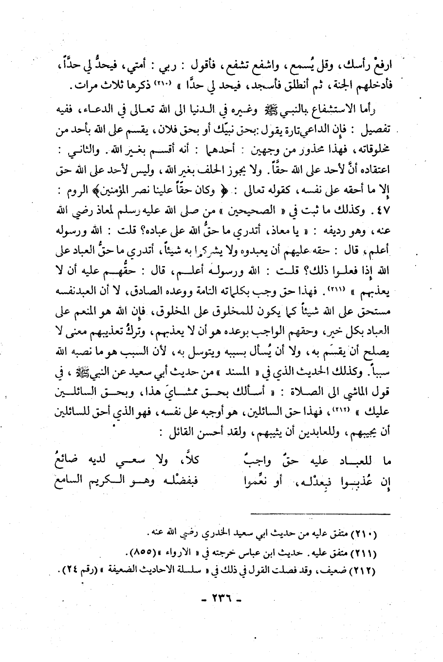 وَأَمَّا الِاسْتِشْفَاعُ بِالنَّبِيِّ صَلَّى اللَّهُ عَلَيْهِ وَسَلَّمَ وَغَيْرِهِ فِي الدُّنْيَا إِلَى اللَّهِ تَعَالَى فِي الدُّعَاءِ، فَفِيهِ تَفْصِيلٌ: فَإِنَّ الدَّاعِيَ تَارَةً يَقُولُ: بِحَقِّ نَبِيِّكَ أَوْ بِحَقِّ فُلَانٍ، يُقْسِمُ عَلَى اللَّهِ بِأَحَدٍ مِنْ مَخْلُوقَاتِهِ، فَهَذَا مَحْذُورٌ مِنْ وَجْهَيْنِ: أَحَدُهُمَا: أَنَّهُ أَقْسَمَ بِغَيْرِ اللَّهِ. وَالثَّانِي: اعْتِقَادُهُ أَنَّ لِأَحَدٍ عَلَى اللَّهِ حَقًّا. وَلَا يَجُوزُ الْحَلِفُ بِغَيْرِ اللَّهِ، وَلَيْسَ لِأَحَدٍ عَلَى اللَّهِ حَقٌّ إِلَّا مَا أَحَقَّهُ عَلَى نَفْسِهِ، كَقَوْلِهِ تَعَالَى: {وَكَانَ حَقًّا عَلَيْنَا نَصْرُ الْمُؤْمِنِين} [الروم: 47]. وكذلك ما ثبت في "الصحيحين" من صَلَّى اللَّهُ عَلَيْهِ وَسَلَّمَ لِمُعَاذٍ رَضِيَ اللَّهُ عَنْهُ، وَهُوَ رَدِيفُهُ: "يَا مُعَاذُ، أَتَدْرِي مَا حَقُّ اللَّهِ عَلَى عِبَادِهِ؟ " قُلْتُ: اللَّهُ وَرَسُولُهُ أَعْلَمُ، قَالَ: "حَقُّهُ عَلَيْهِمْ أَنْ يَعْبُدُوهُ وَلَا يُشْرِكُوا بِهِ شَيْئًا، أَتَدْرِي مَا حَقُّ الْعِبَادِ عَلَى اللَّهِ إِذَا فَعَلُوا ذَلِكَ؟ " قُلْتُ: اللَّهُ وَرَسُولُهُ أَعْلَمُ، قَالَ: "حَقُّهُمْ عَلَيْهِ أَنْ لَا يُعَذِّبَهُمْ"2. فَهَذَا حَقٌّ وَجَبَ بِكَلِمَاتِهِ التَّامَّةِ وَوَعْدِهِ الصَّادِقِ، لَا أَنَّ الْعَبْدَ نَفْسَهُ مُسْتَحِقٌّ عَلَى اللَّهِ شَيْئًا كَمَا يَكُونُ لِلْمَخْلُوقِ عَلَى الْمَخْلُوقِ، فَإِنَّ اللَّهَ هُوَ الْمُنْعِمُ عَلَى الْعِبَادِ بِكُلِّ خَيْرٍ، وَحَقُّهُمُ الْوَاجِبُ بِوَعْدِهِ هُوَ أَنْ لَا يُعَذِّبَهُمْ، وَتَرْكُ تَعْذِيبِهِمْ مَعْنًى لَا يَصْلُحُ أَنْ يُقْسَمَ بِهِ، وَلَا أَنْ يُسْأَلَ بِسَبَبِهِ وَيُتَوَسَّلَ بِهِ، لِأَنَّ السَّبَبَ هُوَ مَا نَصَبَهُ اللَّهُ سَبَبًا. وَكَذَلِكَ الْحَدِيثُ الَّذِي فِي الْمُسْنَدِ مِنْ حَدِيثِ أَبِي سَعِيدٍ عَنِ النَّبِيِّ صَلَّى اللَّهُ عَلَيْهِ وَسَلَّمَ، فِي قَوْلِ الْمَاشِي إِلَى الصَّلَاةِ: "أَسْأَلُكَ بِحَقِّ مَمْشَايَ هَذَا، وَبِحَقِّ السَّائِلِينَ عَلَيْكَ"3، فَهَذَا حَقُّ السَّائِلِينَ، هُوَ أَوْجَبَهُ عَلَى نَفْسِهِ، فَهُوَ الَّذِي أَحَقَّ لِلسَّائِلِينَ أَنْ يُجِيبَهُمْ، وَلِلْعَابِدِينَ أَنْ يُثِيبَهُمْ، وَلَقَدْ أَحْسَنَ الْقَائِلُ: