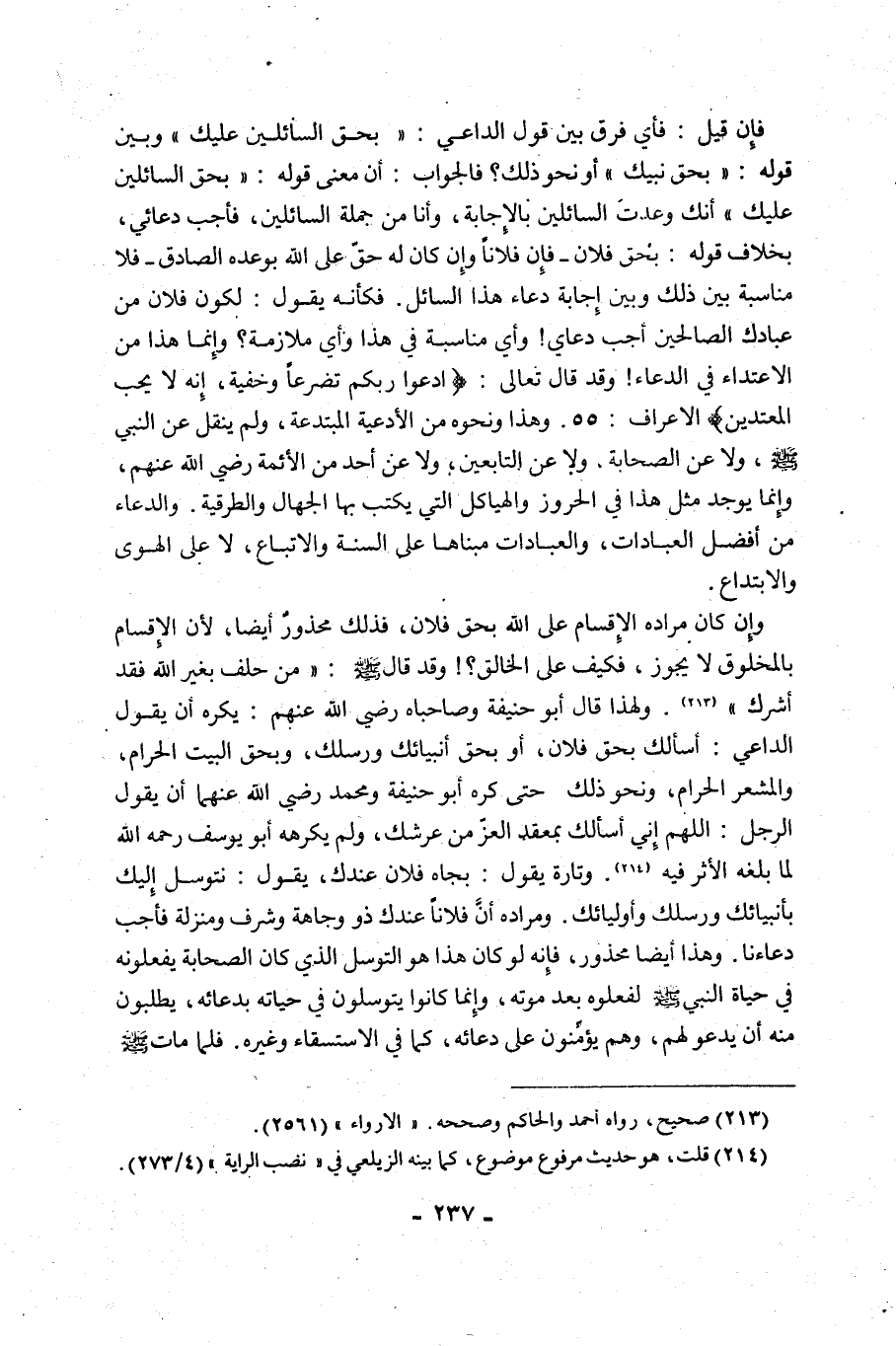 فَإِنْ قِيلَ: فَأَيُّ فَرْقٍ بَيْنَ قَوْلِ الدَّاعِي: "بِحَقِّ السَّائِلِينَ عَلَيْكَ" وَبَيْنَ قَوْلِهِ: "بِحَقِّ نَبِيِّكَ" أَوْ نَحْوِ ذَلِكَ؟ فَالْجَوَابُ: أَنَّ مَعْنَى قَوْلِهِ: "بِحَقِّ السَّائِلِينَ عَلَيْكَ" أَنَّكَ وَعَدْتَ السَّائِلِينَ بِالْإِجَابَةِ، وَأَنَا مِنْ جُمْلَةِ السَّائِلِينَ، فَأَجِبْ دُعَائِي، بِخِلَافِ قَوْلِهِ: بِحَقِّ فُلَانٍ, فَإِنَّ فُلَانًا وَإِنْ كَانَ لَهُ حَقٌّ عَلَى اللَّهِ بِوَعْدِهِ الصَّادِقِ, فَلَا مُنَاسَبَةَ بَيْنَ ذَلِكَ وَبَيْنَ إِجَابَةِ دُعَاءِ هَذَا السَّائِلِ, فَكَأَنَّهُ يَقُولُ: لِكَوْنِ فُلَانٍ مِنْ عِبَادِكَ الصالحين أجب دعاي! وَأَيُّ مُنَاسَبَةٍ فِي هَذَا وَأَيُّ مُلَازَمَةٍ؟ وَإِنَّمَا هَذَا مِنَ الِاعْتِدَاءِ فِي الدُّعَاءِ! وَقَدْ قَالَ تَعَالَى: {ادْعُوا رَبَّكُمْ تَضَرُّعًا وَخُفْيَةً إِنَّهُ لَا يُحِبُّ الْمُعْتَدِينَ} [الْأَعْرَافِ: 55]. وَهَذَا وَنَحْوُهُ مِنَ الْأَدْعِيَةِ الْمُبْتَدَعَةِ، وَلَمْ يُنْقَلْ عَنِ النَّبِيِّ صَلَّى اللَّهُ عَلَيْهِ وَسَلَّمَ، وَلَا عَنِ الصَّحَابَةِ، وَلَا عَنِ التَّابِعِينَ، وَلَا عَنْ أَحَدٍ مِنَ الْأَئِمَّةِ رَضِيَ اللَّهُ عَنْهُمْ، وَإِنَّمَا يُوجَدُ مِثْلُ هَذَا فِي الْحُرُوزِ وَالْهَيَاكِلِ الَّتِي يَكْتُبُ بِهَا الْجُهَّالُ وَالطُّرُقِيَّةُ. وَالدُّعَاءُ مِنْ أَفْضَلِ الْعِبَادَاتِ، وَالْعِبَادَاتُ مَبْنَاهَا عَلَى السُّنَّةِ وَالِاتِّبَاعِ، لَا عَلَى الْهَوَى وَالِابْتِدَاعِ.