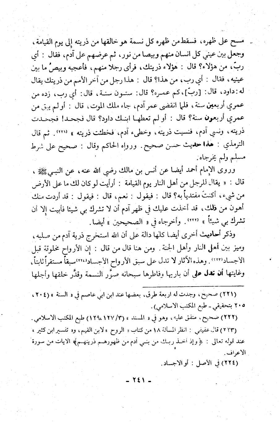وذكر أحاديث أخرى أَيْضًا كُلُّهَا دَالَّةٌ عَلَى أَنَّ اللَّهَ اسْتَخْرَجَ ذُرِّيَّةَ آدَمَ مِنْ صُلْبِهُ، وَمَيَّزَ بَيْنَ أَهْلِ النَّارِ وَأَهْلِ الْجَنَّةِ. وَمِنْ هُنَا قَالَ مَنْ قَالَ: إِنَّ الْأَرْوَاحَ مَخْلُوقَةٌ قَبْلَ الْأَجْسَادِ3. وَهَذِهِ الْآثَارُ لَا تَدُلُّ عَلَى سَبْقِ الْأَرْوَاحِ الْأَجْسَادَ4 سَبْقًا مُسْتَقِرًّا ثَابِتًا، وَغَايَتُهَا أَنْ تَدُلَّ عَلَى أن باريها وَفَاطِرَهَا سُبْحَانَهُ صَوَّرَ النَّسَمَةَ وَقَدَّرَ خَلْقَهَا وَأَجَلَهَا