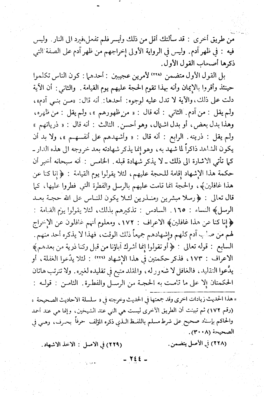بَلِ الْقَوْلُ الْأَوَّلُ مُتَضَمِّنٌ1 لِأَمْرَيْنِ عَجِيبَيْنِ: أَحَدُهُمَا: كَوْنُ النَّاسِ تَكَلَّمُوا حِينَئِذٍ وَأَقَرُّوا بِالْإِيمَانِ وَأَنَّهُ بِهَذَا تَقُومُ الْحُجَّةُ عَلَيْهِمْ يَوْمَ الْقِيَامَةِ. وَالثَّانِي: أَنَّ الْآيَةَ دَلَّتْ عَلَى ذَلِكَ، وَالْآيَةُ لَا تَدُلُّ عَلَيْهِ لِوُجُوهٍ: أَحَدُهَا: أَنَّهُ قَالَ: مِنْ بَنِي آدَمَ، وَلَمْ يَقُلْ: مِنْ آدَمَ. الثَّانِي: أَنَّهُ قَالَ: مِنْ ظُهُورِهِمْ، وَلَمْ يَقُلْ: مِنْ ظَهْرِهِ، وَهَذَا بَدَلُ بَعْضٍ، أَوْ بَدَلُ اشْتِمَالٍ، وَهُوَ أَحْسَنُ. الثَّالِثُ: أَنَّهُ قَالَ: ذُرِّيَّاتِهِمْ وَلَمْ يَقُلْ: ذُرِّيَّتَهُ. الرَّابِعُ: أَنَّهُ قَالَ: "وَأَشْهَدَهُمْ عَلَى أَنْفُسِهِمْ"، وَلَا بُدَّ أَنْ يَكُونَ الشَّاهِدُ ذَاكِرًا لِمَا شَهِدَ بِهِ، وَهُوَ إِنَّمَا يَذْكُرُ شَهَادَتَهُ بَعْدَ خُرُوجِهِ إِلَى هَذِهِ الدَّارِ -كَمَا تَأْتِي الْإِشَارَةُ إِلَى ذَلِكَ- لَا يَذْكُرُ شَهَادَةً قَبْلَهُ. الْخَامِسُ: أَنَّهُ سُبْحَانَهُ أَخْبَرَ أَنَّ حِكْمَةَ هَذَا الْإِشْهَادِ إِقَامَةٌ لِلْحُجَّةِ عَلَيْهِمْ، لِئَلَّا يَقُولُوا يَوْمَ الْقِيَامَةِ: {إِنَّا كُنَّا عَنْ هَذَا غَافِلِينَ}، وَالْحُجَّةُ إِنَّمَا قَامَتْ عَلَيْهِمْ بِالرُّسُلِ وَالْفِطْرَةِ الَّتِي فُطِرُوا عَلَيْهَا، كَمَا قَالَ تَعَالَى: {رُسُلًا مُبَشِّرِينَ وَمُنْذِرِينَ لِئَلَّا يَكُونَ لِلنَّاسِ عَلَى اللَّهِ حُجَّةٌ بَعْدَ الرُّسُلِ} [النِّسَاءِ: 165]. السَّادِسُ: تَذْكِيرُهُمْ بِذَلِكَ، لِئَلَّا يَقُولُوا يَوْمَ الْقِيَامَةِ: {إِنَّا كُنَّا عَنْ هَذَا غَافِلِينَ} [الْأَعْرَافِ: 172]، وَمَعْلُومٌ أَنَّهُمْ غَافِلُونَ عَنِ الْإِخْرَاجِ لَهُمْ مِنْ صُلْبِ آدَمَ كُلِّهُمْ وَإِشْهَادِهِمْ جَمِيعًا ذَلِكَ الْوَقْتَ، فَهَذَا لَا يَذْكُرُهُ أَحَدٌ مِنْهُمْ. السَّابِعُ: قَوْلُهُ تَعَالَى: {أَوْ تَقُولُوا إِنَّمَا أَشْرَكَ آَبَاؤُنَا مِنْ قَبْلُ وَكُنَّا ذُرِّيَّةً مِنْ بَعْدِهِمْ} [الْأَعْرَافِ: 173]، فَذَكَرَ حِكْمَتَيْنِ فِي هَذَا الْإِشْهَادِ2: لِئَلَّا يَدَّعُوا الْغَفْلَةَ، أَوْ يَدَّعُوا التَّقْلِيدَ، فَالْغَافِلُ لَا شُعُورَ لَهُ، وَالْمُقَلِّدُ مُتَّبِعٌ فِي تَقْلِيدِهِ لِغَيْرِهِ. وَلَا تَتَرَتَّبُ هَاتَانِ الْحِكْمَتَانِ إِلَّا عَلَى مَا قَامَتْ بِهِ الحجة من الرسل والفطرة. الثامن: قوله: