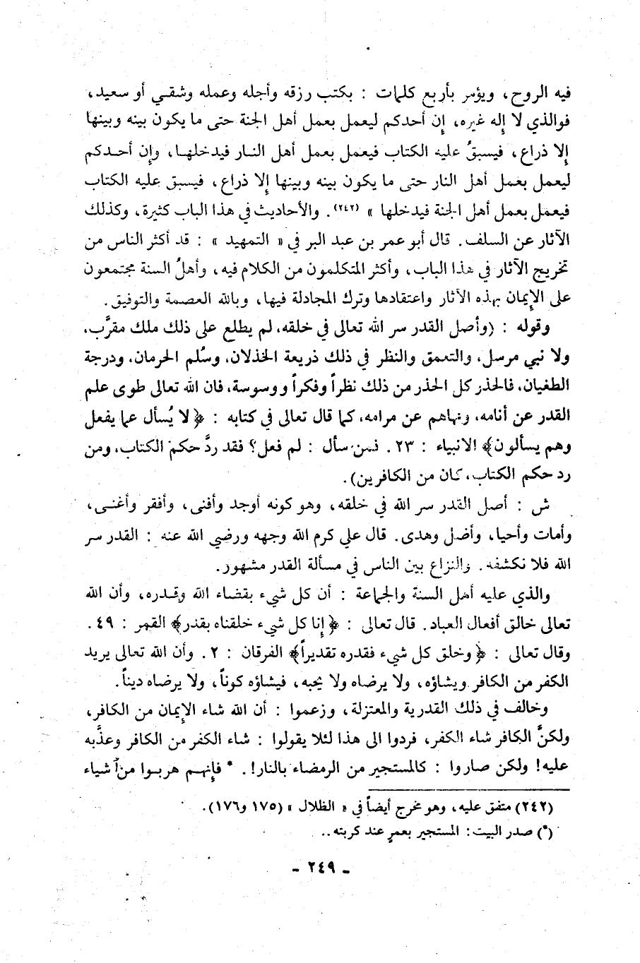 ش: أَصْلُ الْقَدَرِ سِرُّ اللَّهِ فِي خَلْقِهِ، وَهُوَ كَوْنُهُ أَوْجَدَ وَأَفْنَى، وَأَفْقَرَ وَأَغْنَى، وَأَمَاتَ وَأَحْيَا، وَأَضَلَّ وَهَدَى, قال عليّ كرم الله وجهه ورضي الله عنه: القدر سر الله فلا نكشفه, وَالنِّزَاعُ بَيْنَ النَّاسِ فِي مَسْأَلَةِ الْقَدَرِ مَشْهُورٌ.