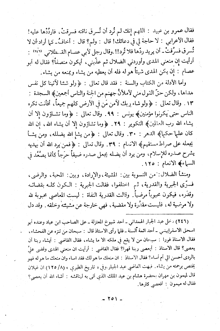 فَقَالَ عَمْرُو بْنُ عُبَيْدٍ: اللَّهُمَّ إِنَّكَ لَمْ تُرِدْ أَنْ تُسْرَقَ نَاقَتُهُ فَسُرِقَتْ، فَارْدُدْهَا عَلَيْهِ! فَقَالَ الْأَعْرَابِيُّ: لَا حَاجَةَ لِي فِي دُعَائِكَ! قَالَ: وَلِمَ؟ قَالَ: أَخَافُ -كَمَا أَرَادَ أَنْ لَا تُسْرَقَ فَسُرِقَتْ- أَنْ يُرِيدَ رَدَّهَا فَلَا تُرَدُّ!! وَقَالَ رَجُلٌ لِأَبِي عِصَامٍ الْقَسْطَلَّانِيِّ1: أَرَأَيْتَ إِنْ مَنَعَنِي الْهُدَى وَأَوْرَدَنِي الضَّلَالَ ثُمَّ عَذَّبَنِي، أَيَكُونُ مُنْصِفًا؟ فَقَالَ لَهُ أَبُو عِصَامٍ: إِنْ يَكُنِ الْهُدَى شَيْئًا هُوَ لَهُ فَلَهُ أَنْ يُعْطِيَهُ مَنْ يَشَاءُ وَيَمْنَعَهُ مَنْ يَشَاءُ.